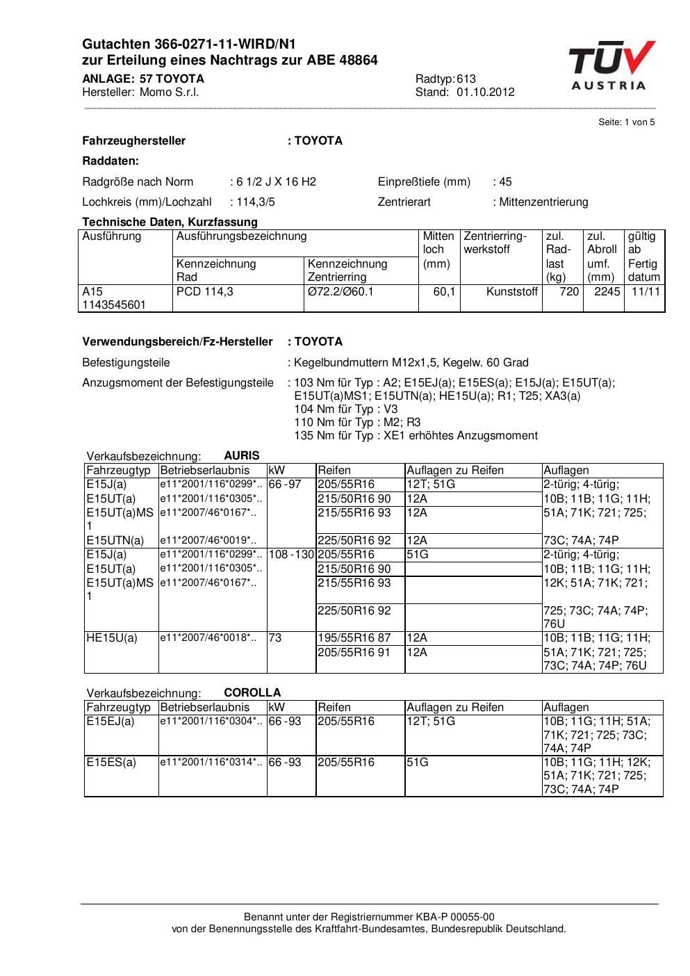 Dieses Gutachten (abe) bezieht sich auf die Alufelge Momo 613 in der Ausführung 2Jx16 ET 0, Mittenloch 0 mm (KBA 48864). Im PDF findest du typischerweise zulässige Reifengrößen, Auflagen/Anbauhinweise und – je nach Dokument – Hinweise zur Eintragung.