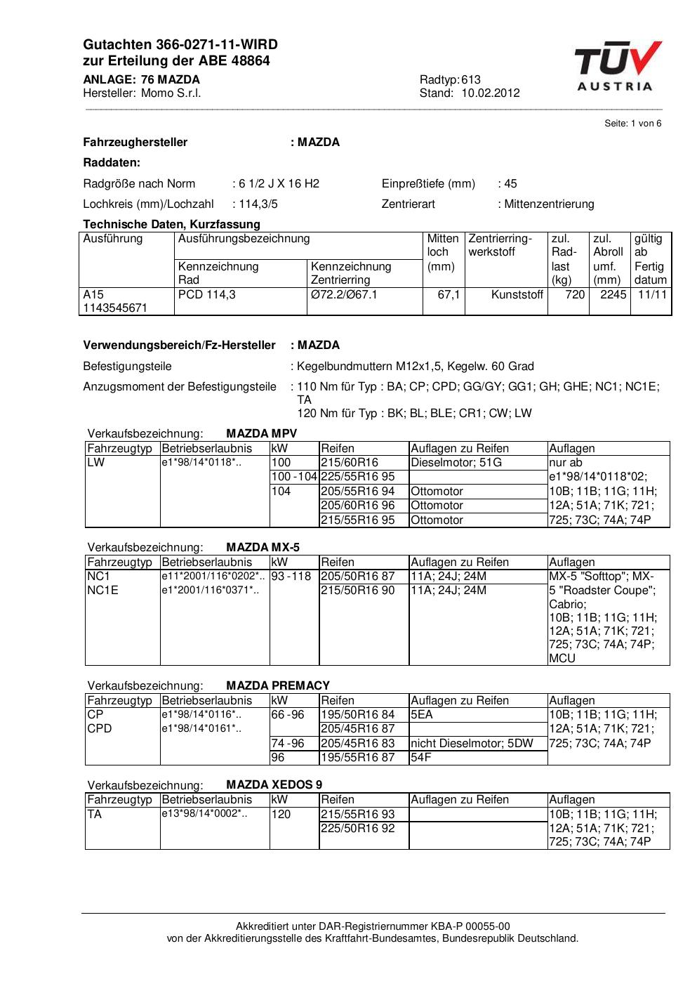 Dieses Gutachten (abe) bezieht sich auf die Alufelge Momo 613 in der Ausführung 2Jx16 ET 0, Mittenloch 0 mm (KBA 48864). Im PDF findest du typischerweise zulässige Reifengrößen, Auflagen/Anbauhinweise und – je nach Dokument – Hinweise zur Eintragung.