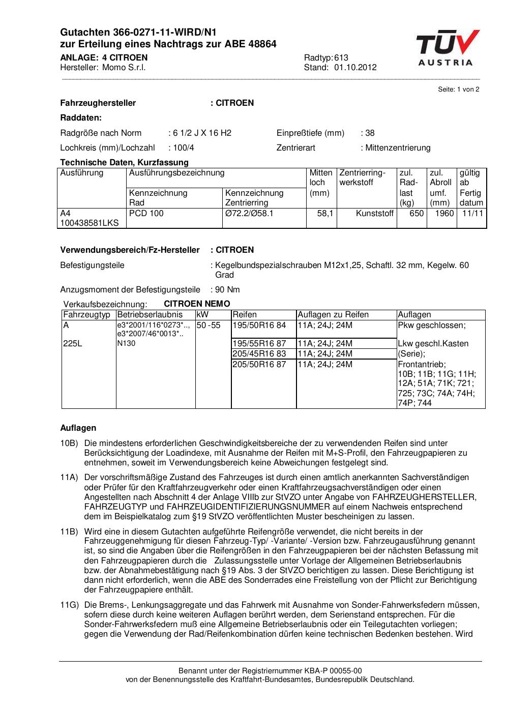 Dieses Gutachten (abe) bezieht sich auf die Alufelge Momo 613 in der Ausführung 2Jx16 ET 0, Mittenloch 0 mm (KBA 48864). Im PDF findest du typischerweise zulässige Reifengrößen, Auflagen/Anbauhinweise und – je nach Dokument – Hinweise zur Eintragung.