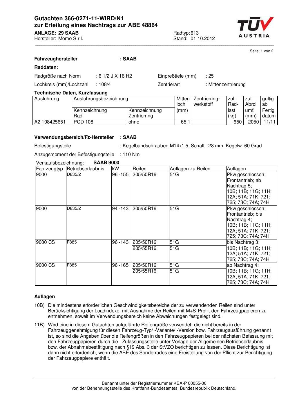 Dieses Gutachten (abe) bezieht sich auf die Alufelge Momo 613 in der Ausführung 2Jx16 ET 0, Mittenloch 0 mm (KBA 48864). Im PDF findest du typischerweise zulässige Reifengrößen, Auflagen/Anbauhinweise und – je nach Dokument – Hinweise zur Eintragung.