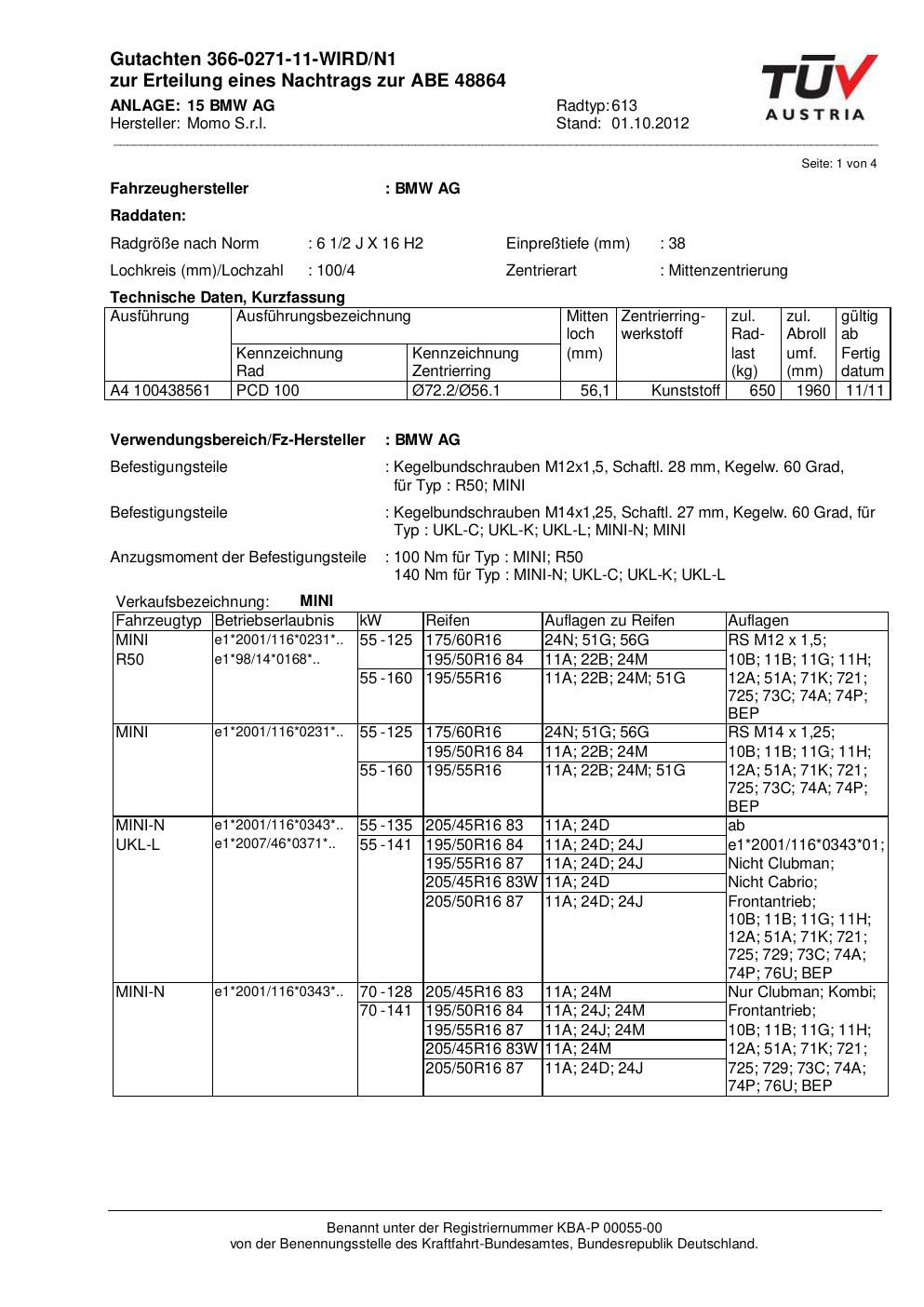 Dieses Gutachten (abe) bezieht sich auf die Alufelge Momo 613 in der Ausführung 2Jx16 ET 0, Mittenloch 0 mm (KBA 48864). Im PDF findest du typischerweise zulässige Reifengrößen, Auflagen/Anbauhinweise und – je nach Dokument – Hinweise zur Eintragung.