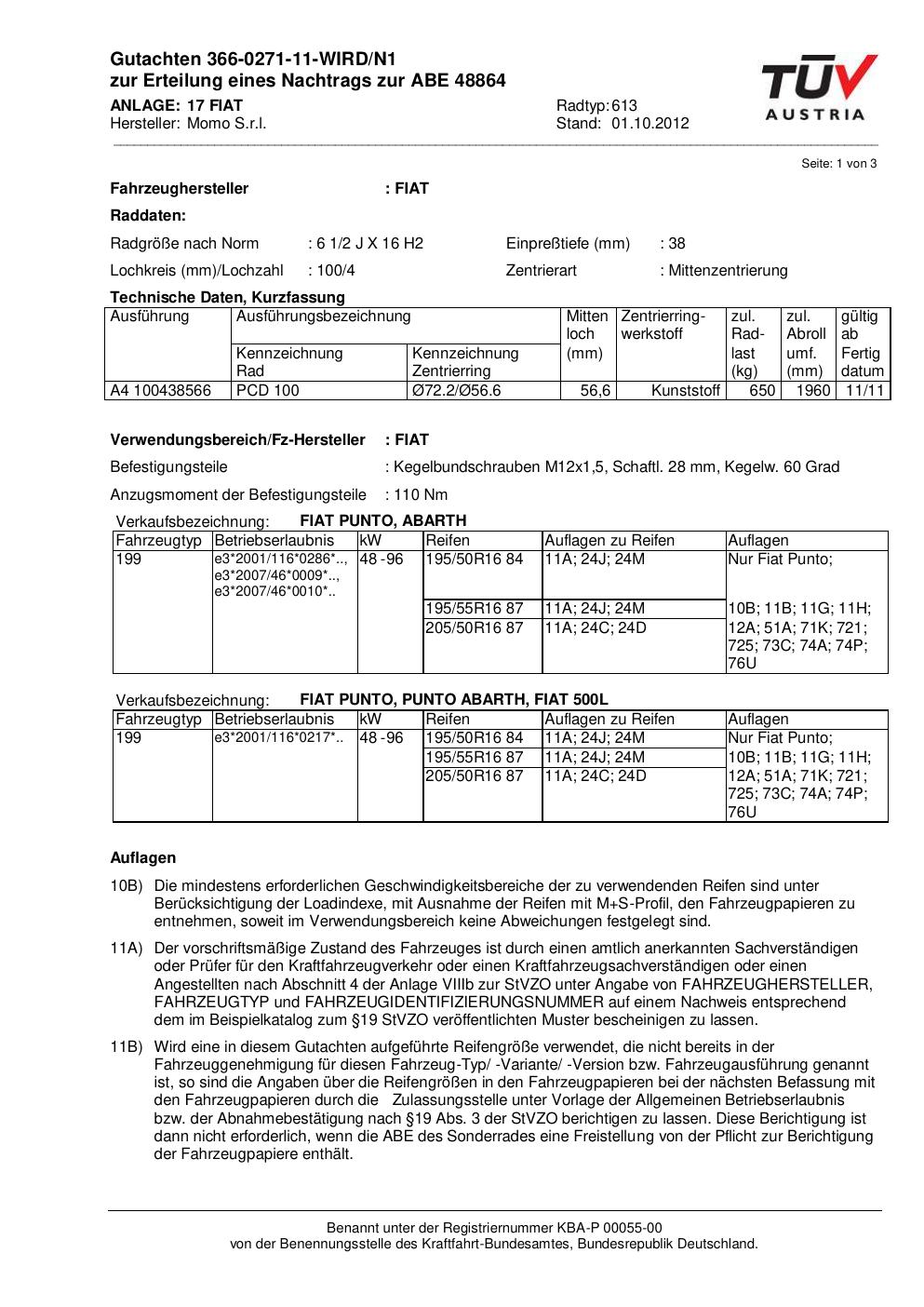 Dieses Gutachten (abe) bezieht sich auf die Alufelge Momo 613 in der Ausführung 2Jx16 ET 0, Mittenloch 0 mm (KBA 48864). Im PDF findest du typischerweise zulässige Reifengrößen, Auflagen/Anbauhinweise und – je nach Dokument – Hinweise zur Eintragung.