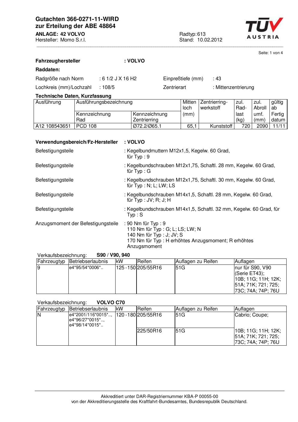 Dieses abe gehört zur Felge Momo 613 in 2Jx16 ET0 mit KBA 48864. Die Seite ist dafür gedacht, dass du schnell prüfen kannst, ob KBA, Design und Größe zu deiner Felge passen und danach direkt das richtige PDF lädst.