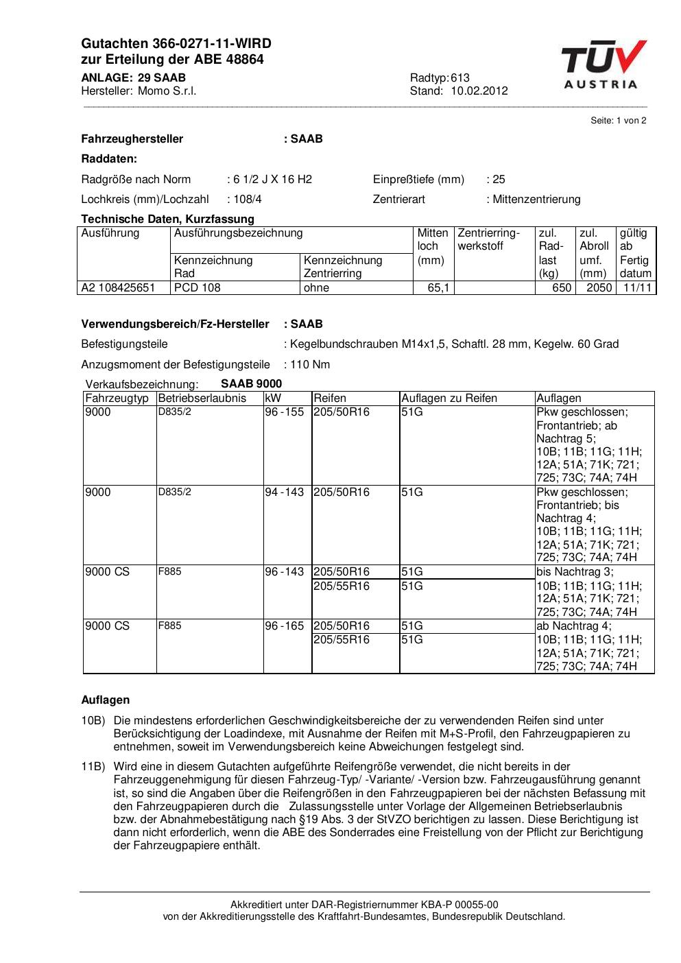 Dieses Gutachten (abe) bezieht sich auf die Alufelge Momo 613 in der Ausführung 2Jx16 ET 0, Mittenloch 0 mm (KBA 48864). Im PDF findest du typischerweise zulässige Reifengrößen, Auflagen/Anbauhinweise und – je nach Dokument – Hinweise zur Eintragung.