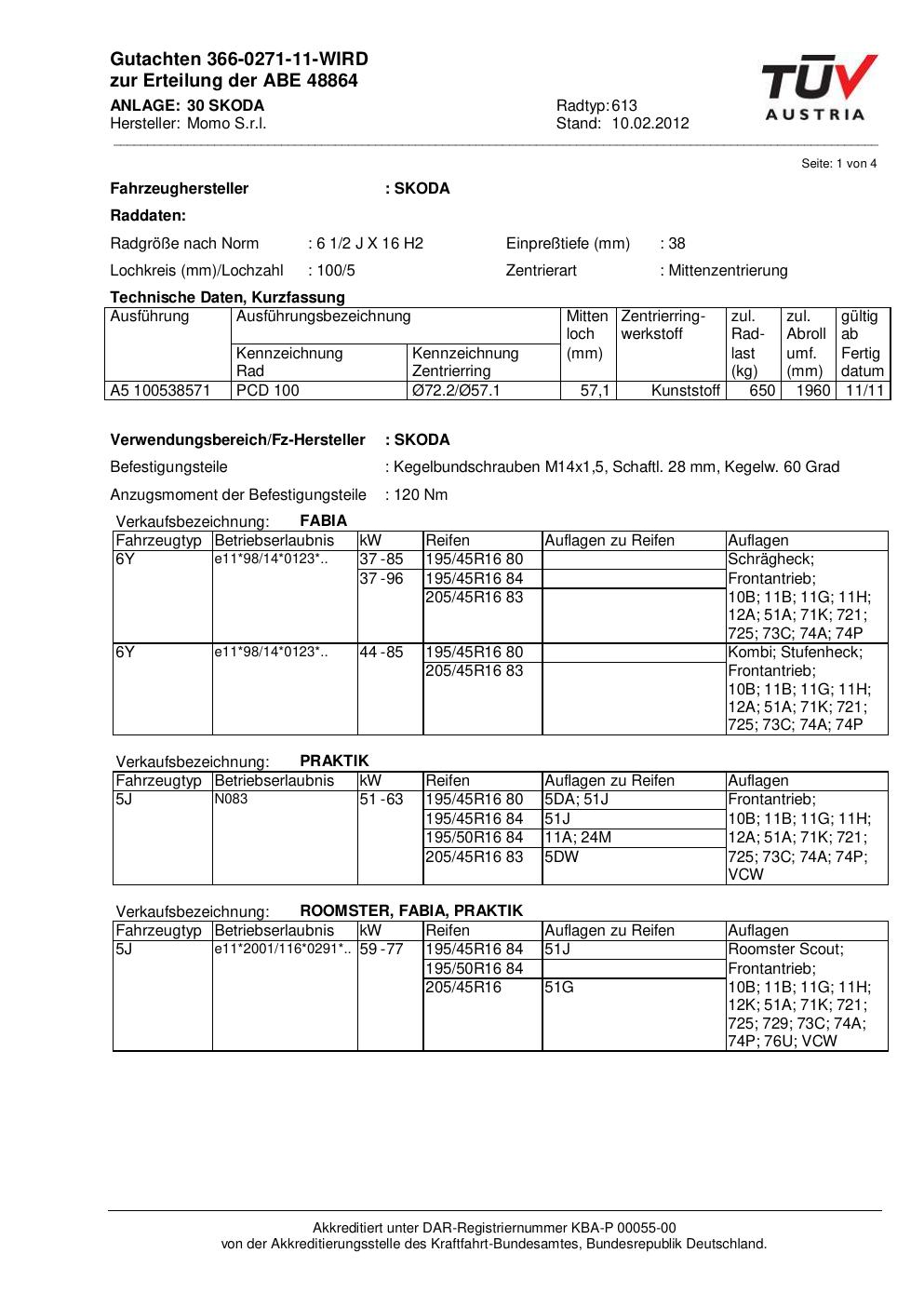 Dieses Gutachten (abe) bezieht sich auf die Alufelge Momo 613 in der Ausführung 2Jx16 ET 0, Mittenloch 0 mm (KBA 48864). Im PDF findest du typischerweise zulässige Reifengrößen, Auflagen/Anbauhinweise und – je nach Dokument – Hinweise zur Eintragung.