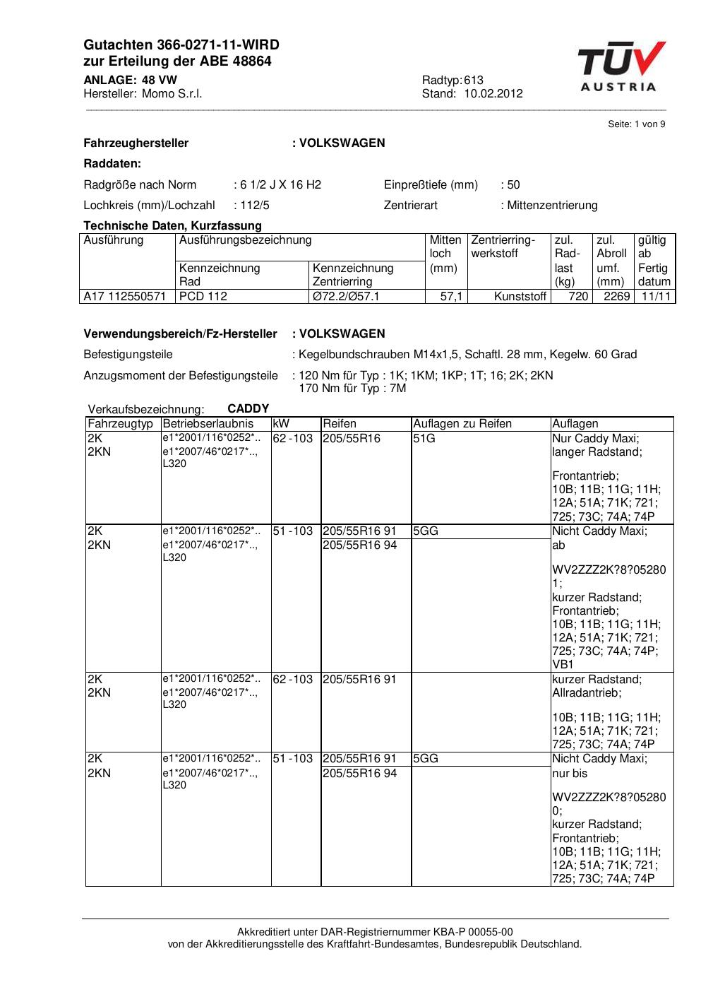 Dieses abe gehört zur Felge Momo 613 in 2Jx16 ET0 mit KBA 48864. Die Seite ist dafür gedacht, dass du schnell prüfen kannst, ob KBA, Design und Größe zu deiner Felge passen und danach direkt das richtige PDF lädst.