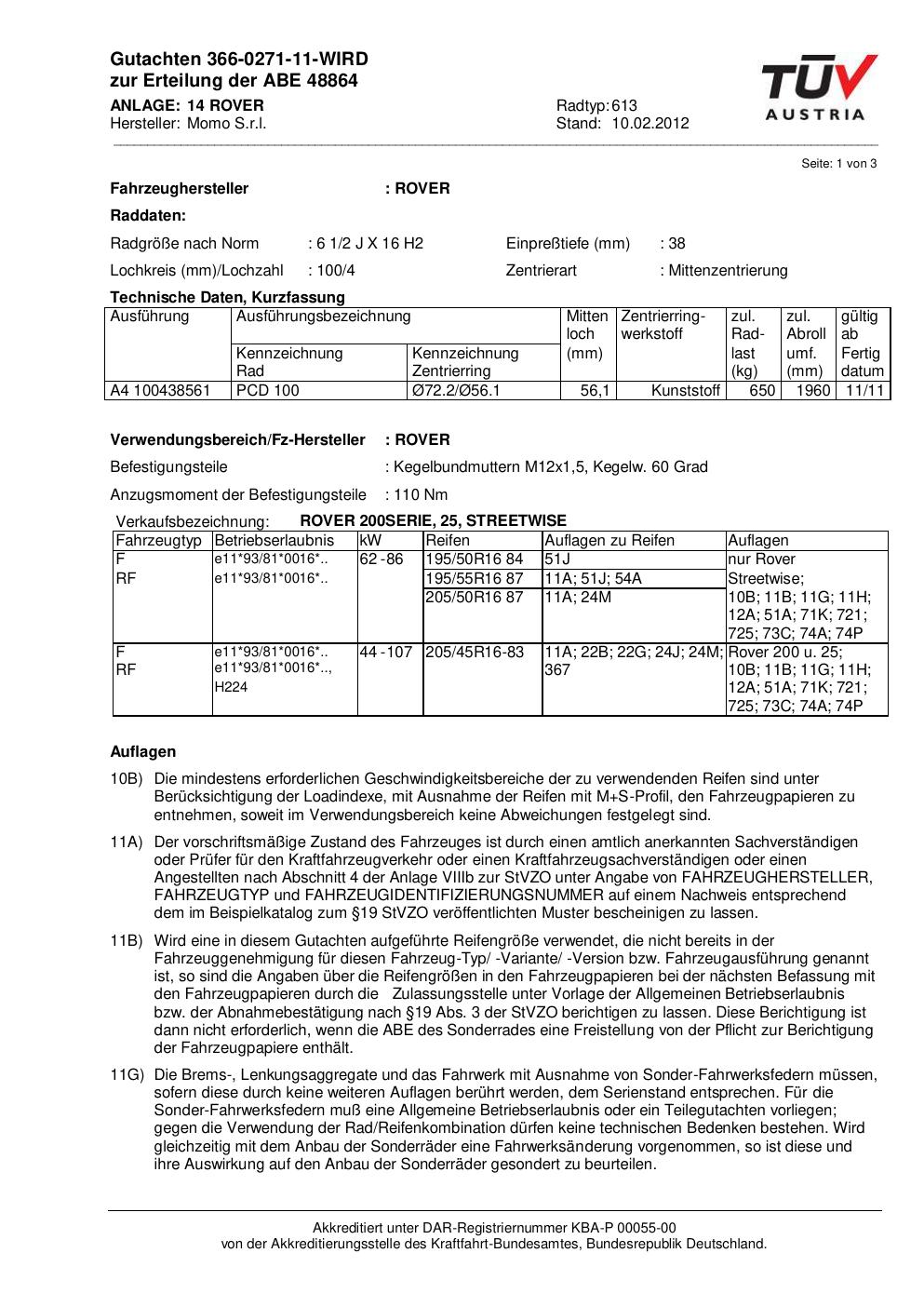 Dieses Gutachten (abe) bezieht sich auf die Alufelge Momo 613 in der Ausführung 2Jx16 ET 0, Mittenloch 0 mm (KBA 48864). Im PDF findest du typischerweise zulässige Reifengrößen, Auflagen/Anbauhinweise und – je nach Dokument – Hinweise zur Eintragung.