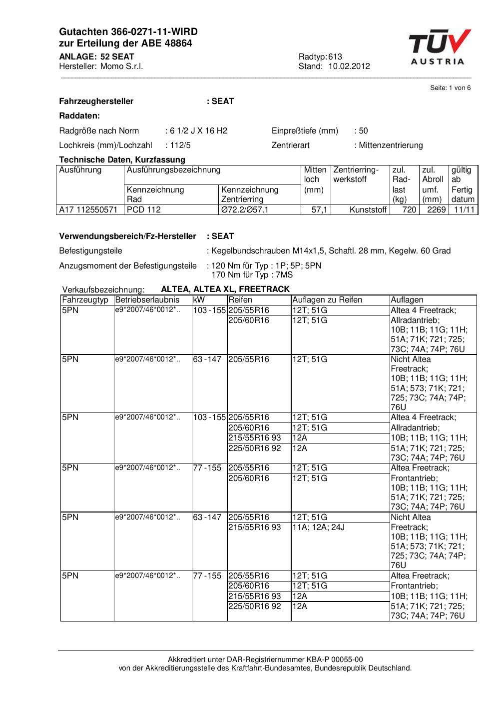 Dieses Gutachten (abe) bezieht sich auf die Alufelge Momo 613 in der Ausführung 2Jx16 ET 0, Mittenloch 0 mm (KBA 48864). Im PDF findest du typischerweise zulässige Reifengrößen, Auflagen/Anbauhinweise und – je nach Dokument – Hinweise zur Eintragung.