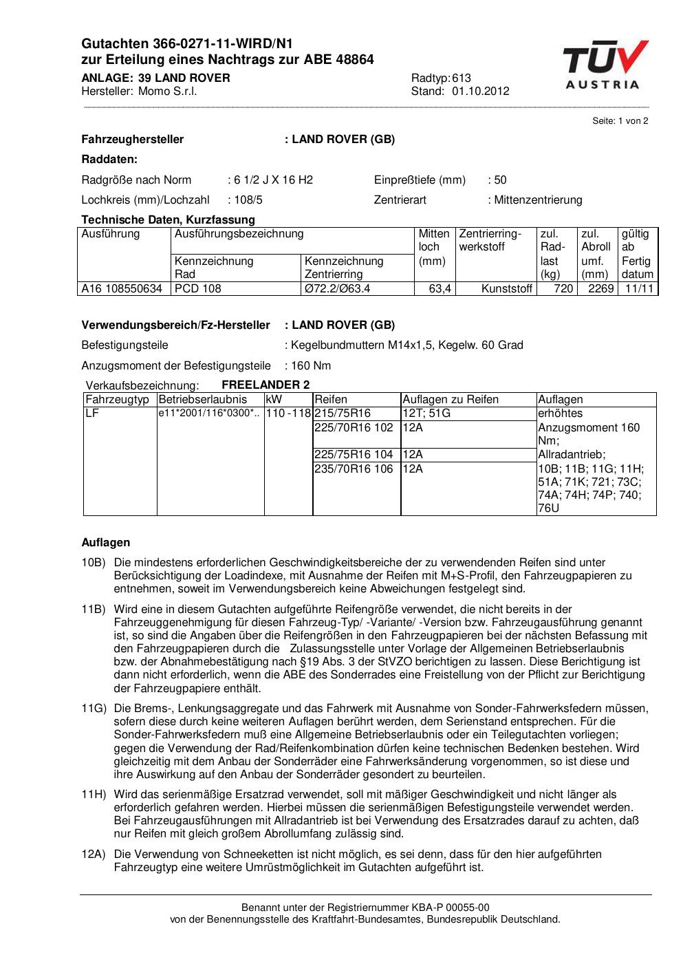 Dieses Gutachten (abe) bezieht sich auf die Alufelge Momo 613 in der Ausführung 2Jx16 ET 0, Mittenloch 0 mm (KBA 48864). Im PDF findest du typischerweise zulässige Reifengrößen, Auflagen/Anbauhinweise und – je nach Dokument – Hinweise zur Eintragung.