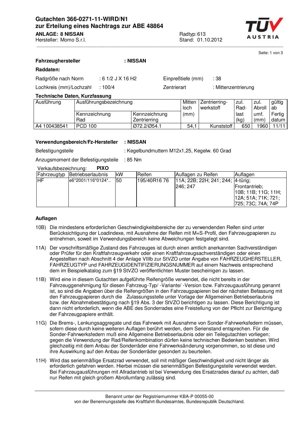 Dieses Gutachten (abe) bezieht sich auf die Alufelge Momo 613 in der Ausführung 2Jx16 ET 0, Mittenloch 0 mm (KBA 48864). Im PDF findest du typischerweise zulässige Reifengrößen, Auflagen/Anbauhinweise und – je nach Dokument – Hinweise zur Eintragung.