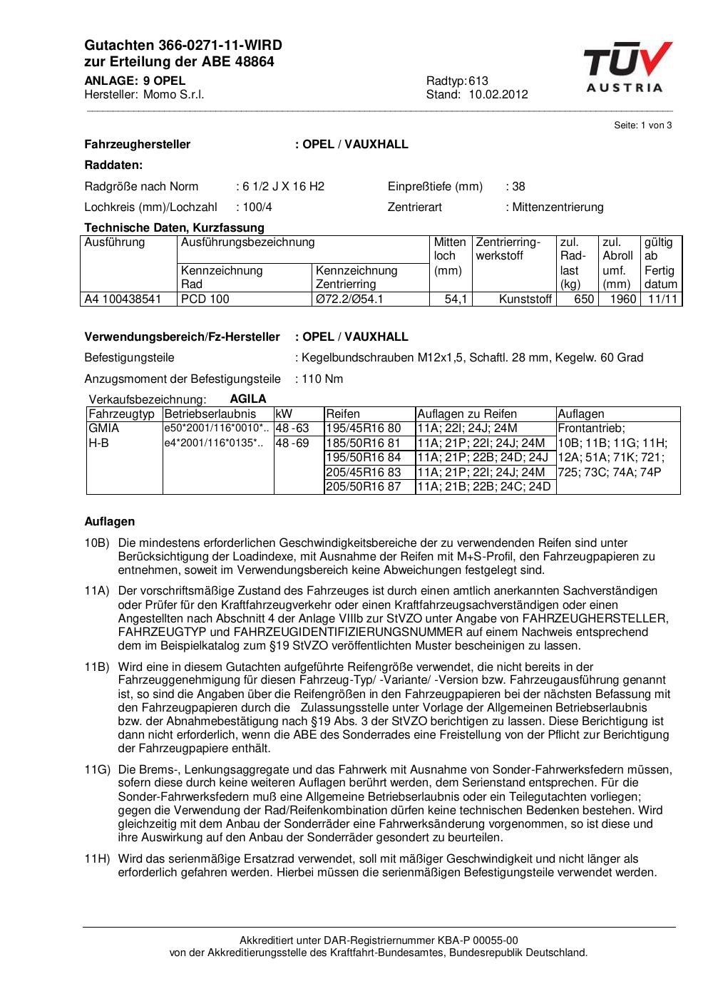Dieses Gutachten (abe) bezieht sich auf die Alufelge Momo 613 in der Ausführung 2Jx16 ET 0, Mittenloch 0 mm (KBA 48864). Im PDF findest du typischerweise zulässige Reifengrößen, Auflagen/Anbauhinweise und – je nach Dokument – Hinweise zur Eintragung.