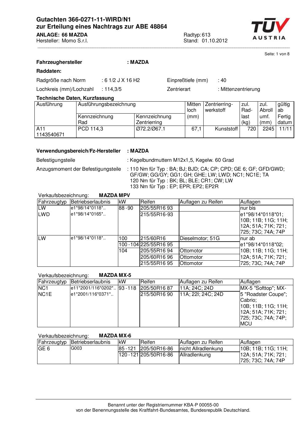 Dieses Gutachten (abe) bezieht sich auf die Alufelge Momo 613 in der Ausführung 2Jx16 ET 0, Mittenloch 0 mm (KBA 48864). Im PDF findest du typischerweise zulässige Reifengrößen, Auflagen/Anbauhinweise und – je nach Dokument – Hinweise zur Eintragung.