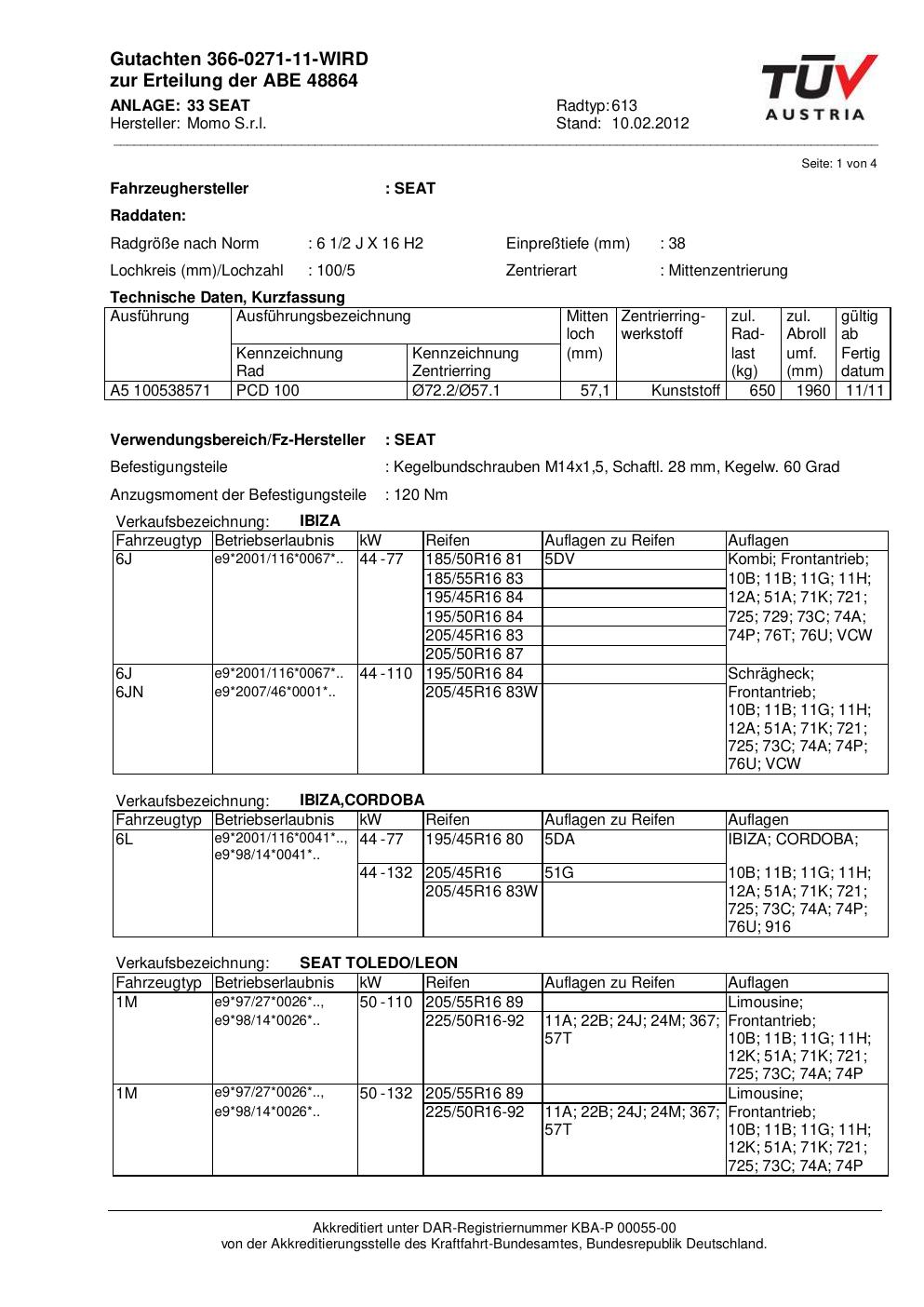 Dieses Gutachten (abe) bezieht sich auf die Alufelge Momo 613 in der Ausführung 2Jx16 ET 0, Mittenloch 0 mm (KBA 48864). Im PDF findest du typischerweise zulässige Reifengrößen, Auflagen/Anbauhinweise und – je nach Dokument – Hinweise zur Eintragung.