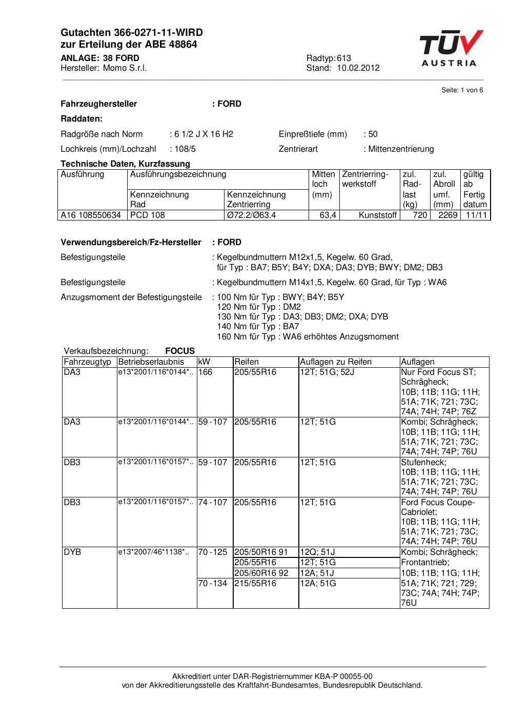 Dieses Gutachten (abe) bezieht sich auf die Alufelge Momo 613 in der Ausführung 2Jx16 ET 0, Mittenloch 0 mm (KBA 48864). Im PDF findest du typischerweise zulässige Reifengrößen, Auflagen/Anbauhinweise und – je nach Dokument – Hinweise zur Eintragung.