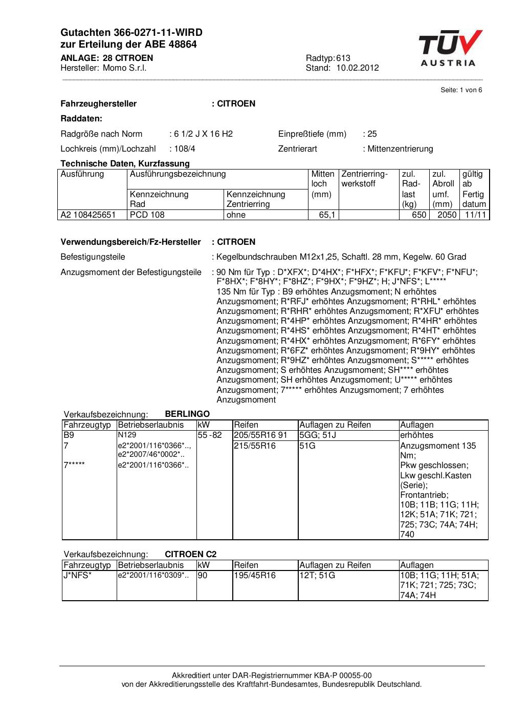 Dieses Gutachten (abe) bezieht sich auf die Alufelge Momo 613 in der Ausführung 2Jx16 ET 0, Mittenloch 0 mm (KBA 48864). Im PDF findest du typischerweise zulässige Reifengrößen, Auflagen/Anbauhinweise und – je nach Dokument – Hinweise zur Eintragung.