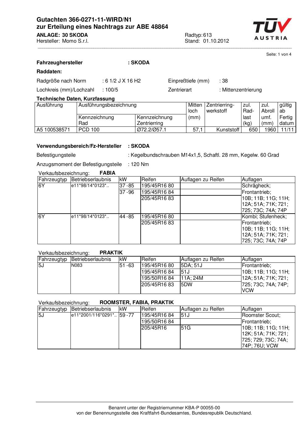 Dieses Gutachten (abe) bezieht sich auf die Alufelge Momo 613 in der Ausführung 2Jx16 ET 0, Mittenloch 0 mm (KBA 48864). Im PDF findest du typischerweise zulässige Reifengrößen, Auflagen/Anbauhinweise und – je nach Dokument – Hinweise zur Eintragung.