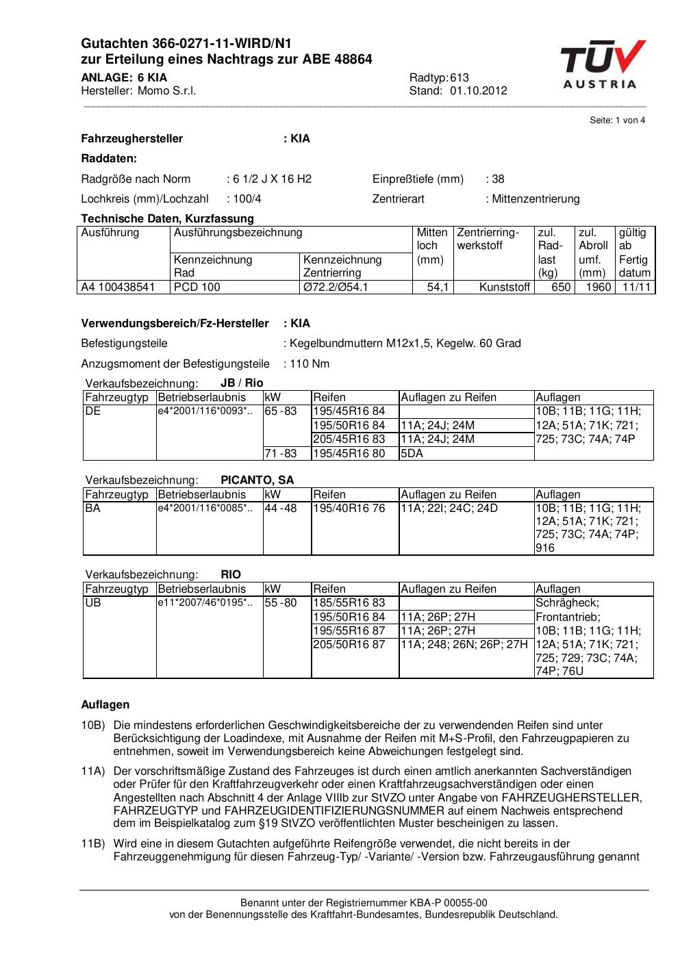 Dieses Gutachten (abe) bezieht sich auf die Alufelge Momo 613 in der Ausführung 2Jx16 ET 0, Mittenloch 0 mm (KBA 48864). Im PDF findest du typischerweise zulässige Reifengrößen, Auflagen/Anbauhinweise und – je nach Dokument – Hinweise zur Eintragung.
