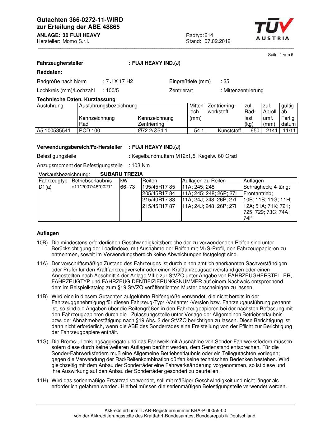 Dieses Gutachten (abe) bezieht sich auf die Alufelge Momo 614 in der Ausführung 7Jx17 ET 0, Mittenloch 0 mm (KBA 48865). Im PDF findest du typischerweise zulässige Reifengrößen, Auflagen/Anbauhinweise und – je nach Dokument – Hinweise zur Eintragung.