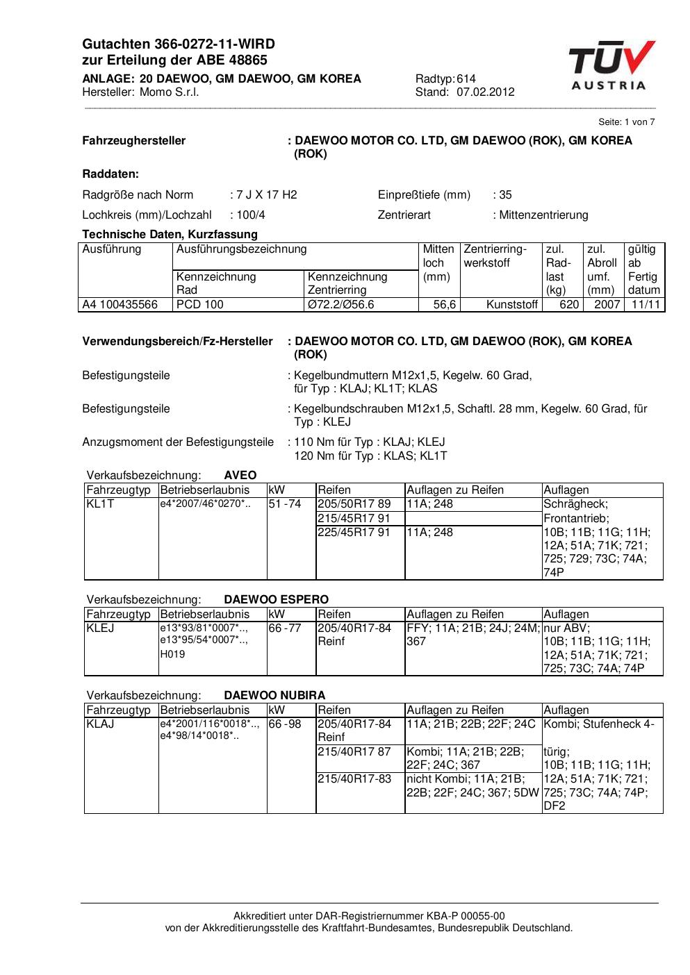Felgengutachten / abe für Alufelgen Momo 614 (7Jx17 ET 0, Mittenloch 0 mm) mit KBA 48865 (Zertifikatsnummer 48865). Hier kostenlos als PDF herunterladen. Der Download-Link ist 24 Stunden gültig und kann bis zu zwei Mal verwendet werden.