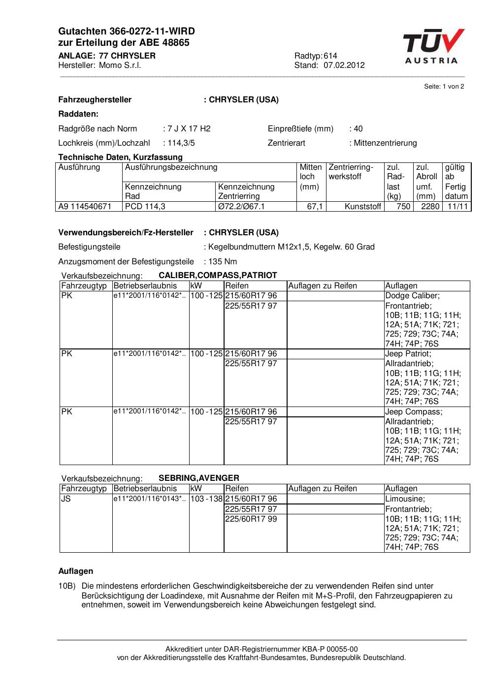 Dieses Gutachten (abe) bezieht sich auf die Alufelge Momo 614 in der Ausführung 7Jx17 ET 0, Mittenloch 0 mm (KBA 48865). Im PDF findest du typischerweise zulässige Reifengrößen, Auflagen/Anbauhinweise und – je nach Dokument – Hinweise zur Eintragung.