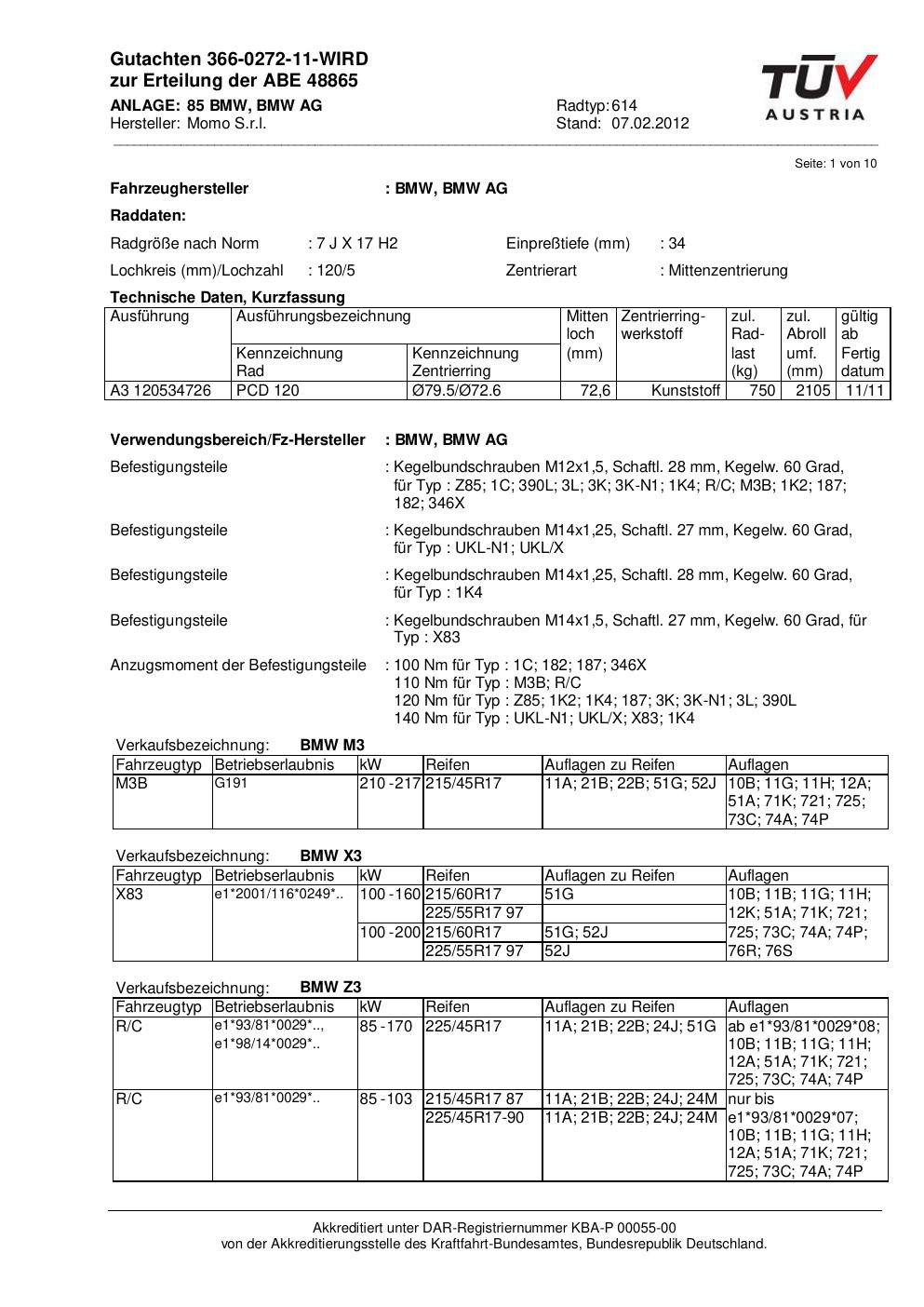 Dieses Gutachten (abe) bezieht sich auf die Alufelge Momo 614 in der Ausführung 7Jx17 ET 0, Mittenloch 0 mm (KBA 48865). Im PDF findest du typischerweise zulässige Reifengrößen, Auflagen/Anbauhinweise und – je nach Dokument – Hinweise zur Eintragung.