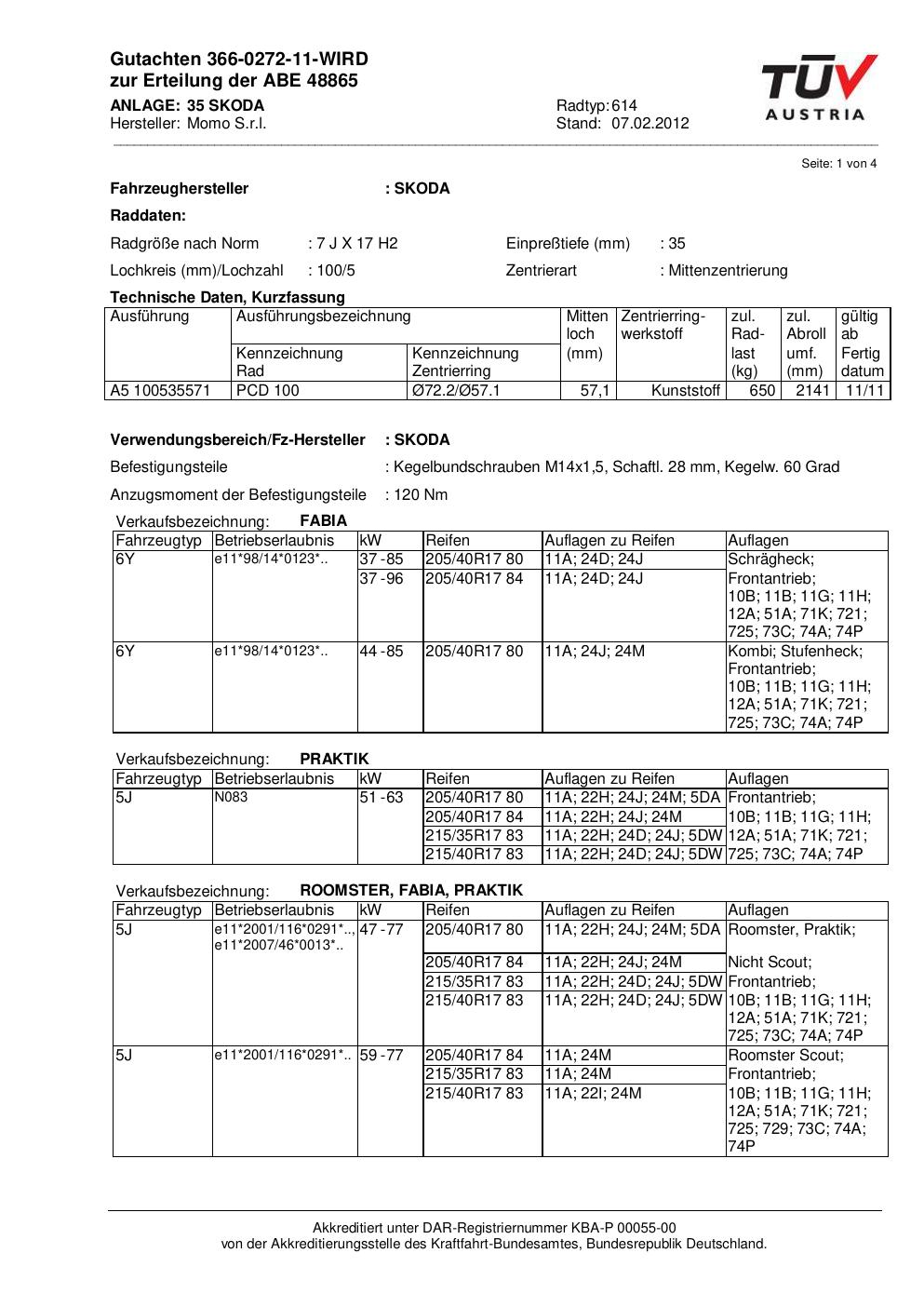 Dieses Gutachten (abe) bezieht sich auf die Alufelge Momo 614 in der Ausführung 7Jx17 ET 0, Mittenloch 0 mm (KBA 48865). Im PDF findest du typischerweise zulässige Reifengrößen, Auflagen/Anbauhinweise und – je nach Dokument – Hinweise zur Eintragung.