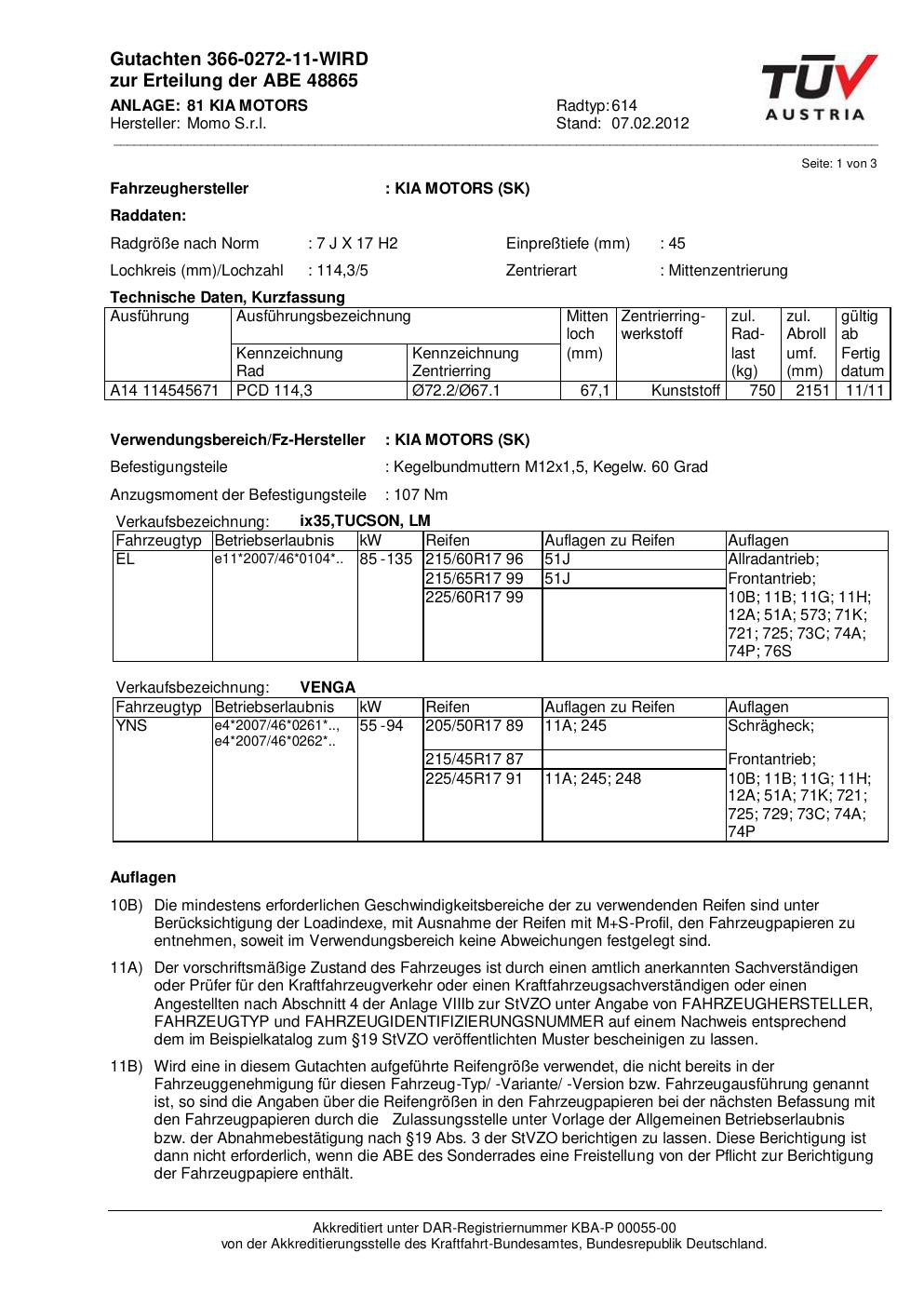 Dieses Gutachten (abe) bezieht sich auf die Alufelge Momo 614 in der Ausführung 7Jx17 ET 0, Mittenloch 0 mm (KBA 48865). Im PDF findest du typischerweise zulässige Reifengrößen, Auflagen/Anbauhinweise und – je nach Dokument – Hinweise zur Eintragung.