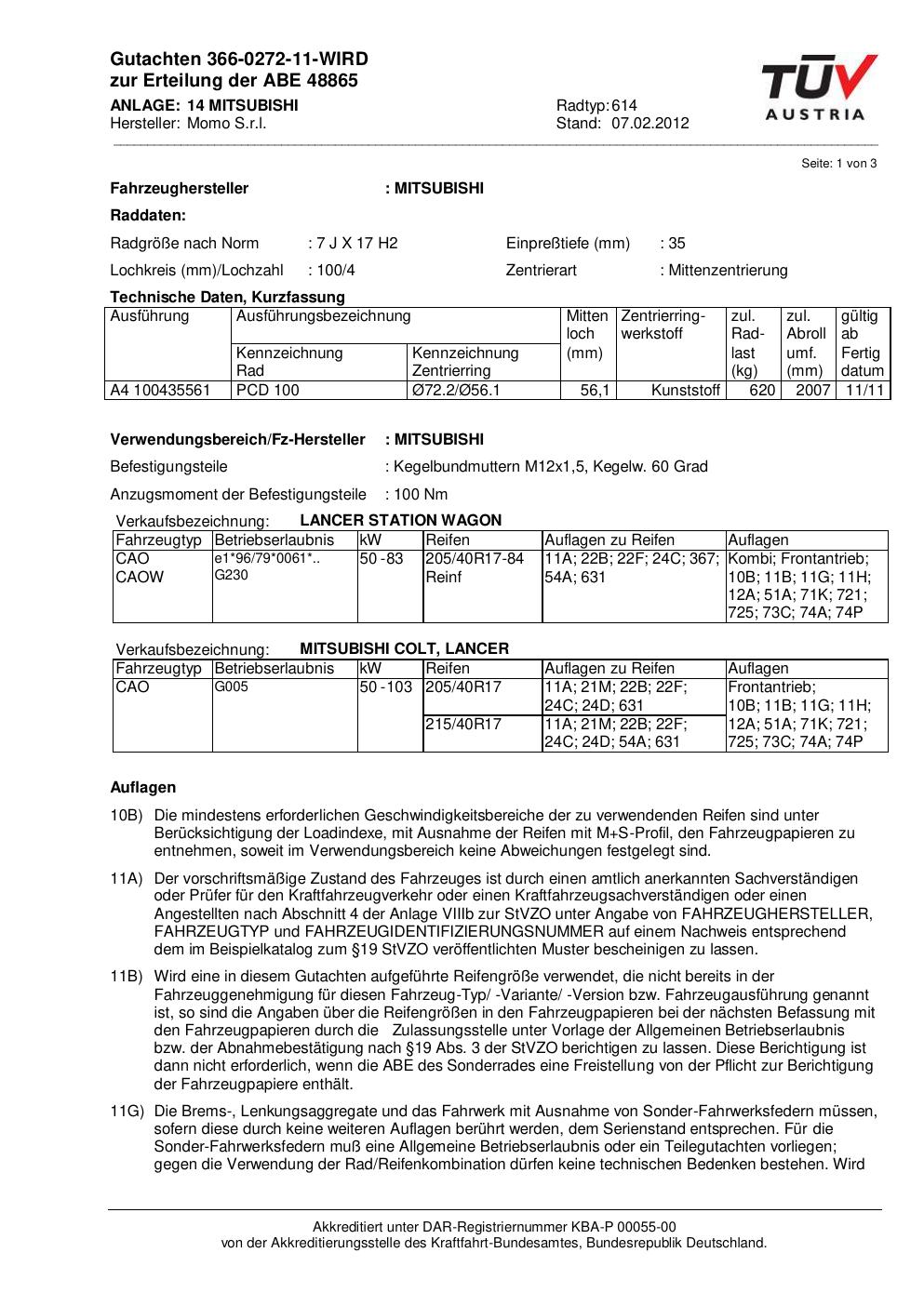 Dieses Gutachten (abe) bezieht sich auf die Alufelge Momo 614 in der Ausführung 7Jx17 ET 0, Mittenloch 0 mm (KBA 48865). Im PDF findest du typischerweise zulässige Reifengrößen, Auflagen/Anbauhinweise und – je nach Dokument – Hinweise zur Eintragung.