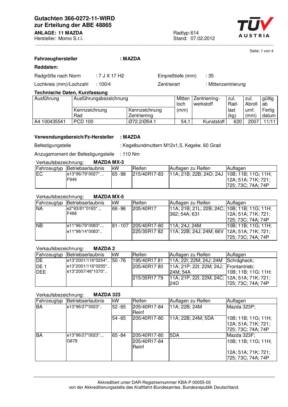 Dieses Gutachten (abe) bezieht sich auf die Alufelge Momo 614 in der Ausführung 7Jx17 ET 0, Mittenloch 0 mm (KBA 48865). Im PDF findest du typischerweise zulässige Reifengrößen, Auflagen/Anbauhinweise und – je nach Dokument – Hinweise zur Eintragung.