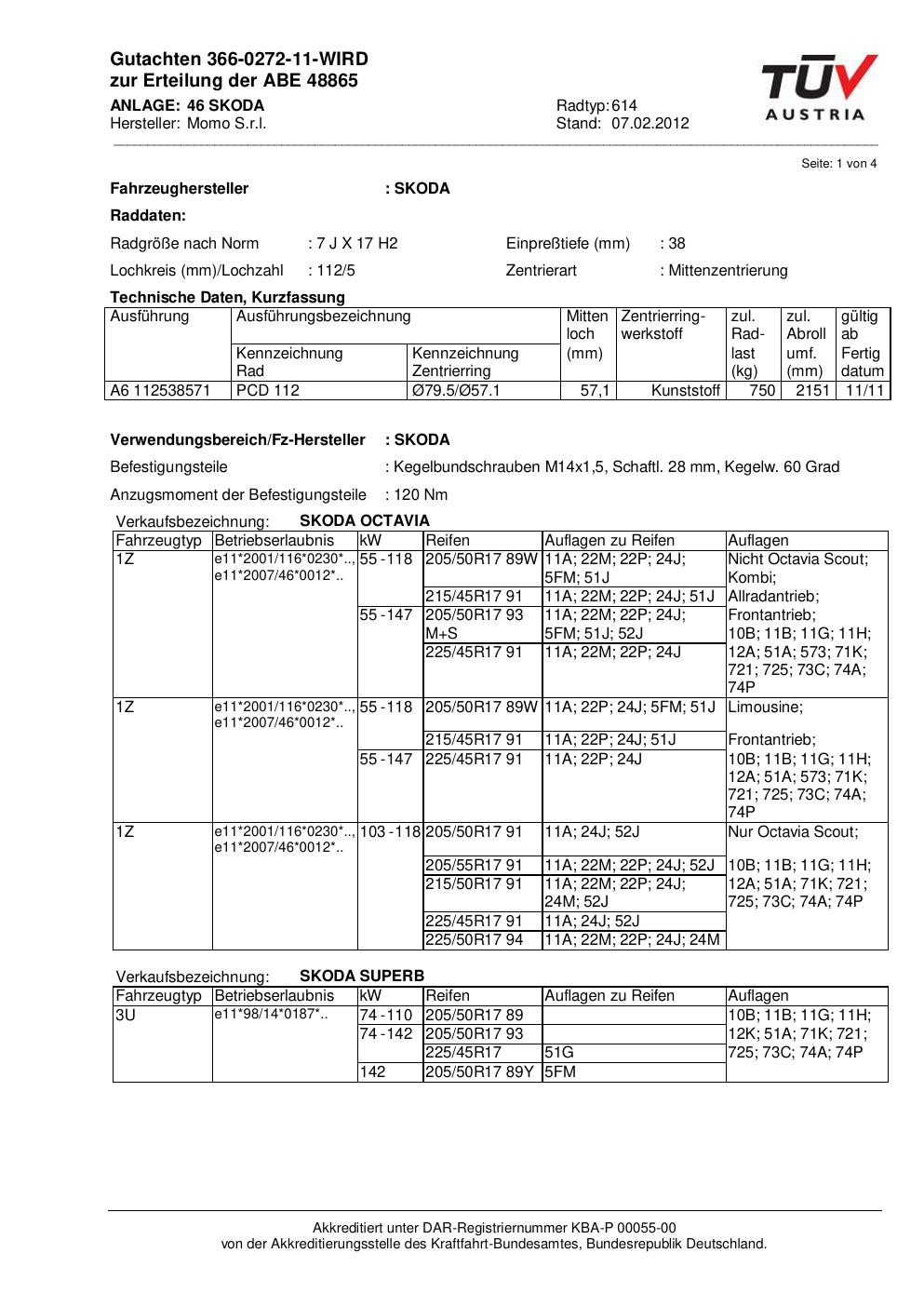 Dieses Gutachten (abe) bezieht sich auf die Alufelge Momo 614 in der Ausführung 7Jx17 ET 0, Mittenloch 0 mm (KBA 48865). Im PDF findest du typischerweise zulässige Reifengrößen, Auflagen/Anbauhinweise und – je nach Dokument – Hinweise zur Eintragung.