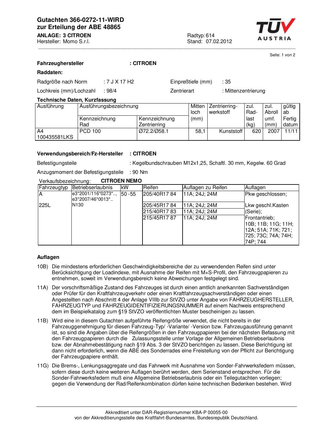 Dieses Gutachten (abe) bezieht sich auf die Alufelge Momo 614 in der Ausführung 7Jx17 ET 0, Mittenloch 0 mm (KBA 48865). Im PDF findest du typischerweise zulässige Reifengrößen, Auflagen/Anbauhinweise und – je nach Dokument – Hinweise zur Eintragung.
