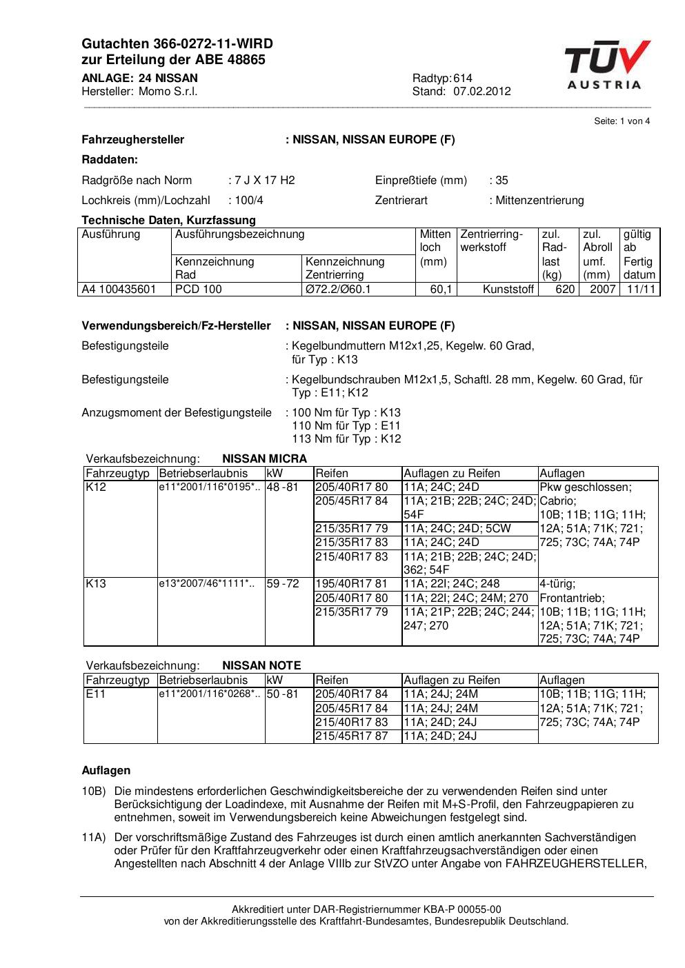 Dieses Gutachten (abe) bezieht sich auf die Alufelge Momo 614 in der Ausführung 7Jx17 ET 0, Mittenloch 0 mm (KBA 48865). Im PDF findest du typischerweise zulässige Reifengrößen, Auflagen/Anbauhinweise und – je nach Dokument – Hinweise zur Eintragung.