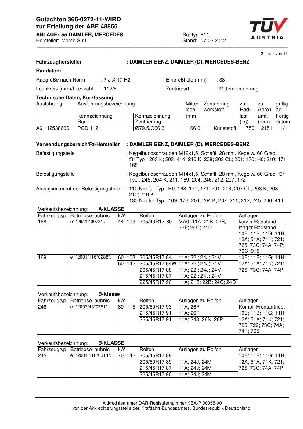 Dieses Gutachten (abe) bezieht sich auf die Alufelge Momo 614 in der Ausführung 7Jx17 ET 0, Mittenloch 0 mm (KBA 48865). Im PDF findest du typischerweise zulässige Reifengrößen, Auflagen/Anbauhinweise und – je nach Dokument – Hinweise zur Eintragung.