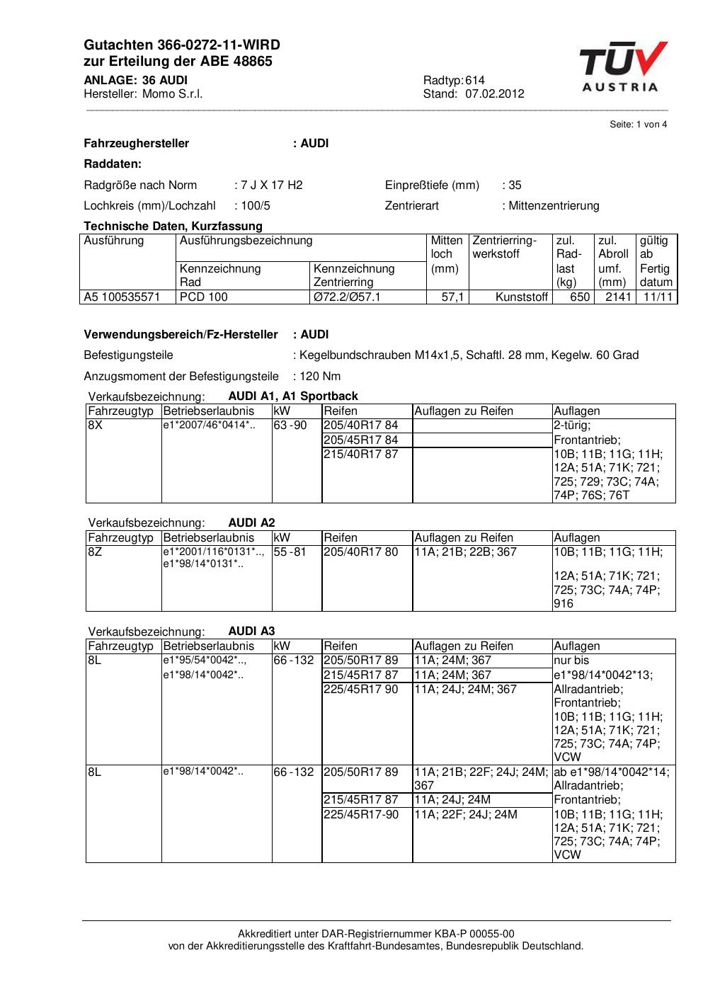 Dieses Gutachten (abe) bezieht sich auf die Alufelge Momo 614 in der Ausführung 7Jx17 ET 0, Mittenloch 0 mm (KBA 48865). Im PDF findest du typischerweise zulässige Reifengrößen, Auflagen/Anbauhinweise und – je nach Dokument – Hinweise zur Eintragung.