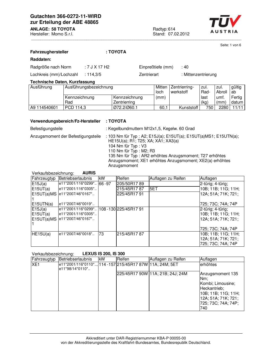Dieses Gutachten (abe) bezieht sich auf die Alufelge Momo 614 in der Ausführung 7Jx17 ET 0, Mittenloch 0 mm (KBA 48865). Im PDF findest du typischerweise zulässige Reifengrößen, Auflagen/Anbauhinweise und – je nach Dokument – Hinweise zur Eintragung.
