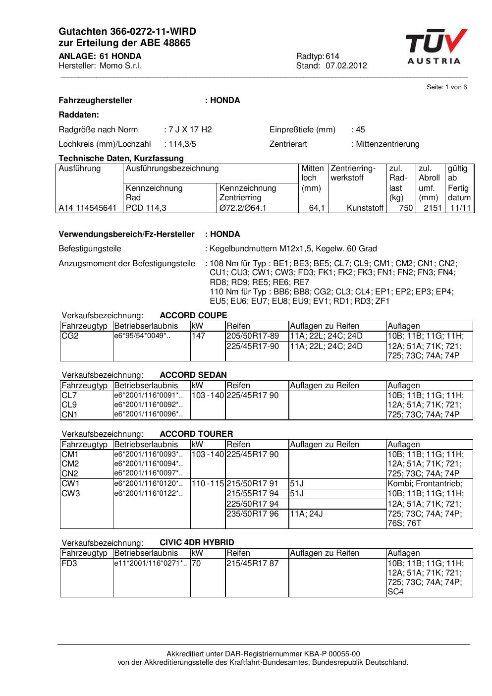 Felgengutachten / abe für Alufelgen Momo 614 (7Jx17 ET 0, Mittenloch 0 mm) mit KBA 48865 (Zertifikatsnummer 48865). Hier kostenlos als PDF herunterladen. Der Download-Link ist 24 Stunden gültig und kann bis zu zwei Mal verwendet werden.
