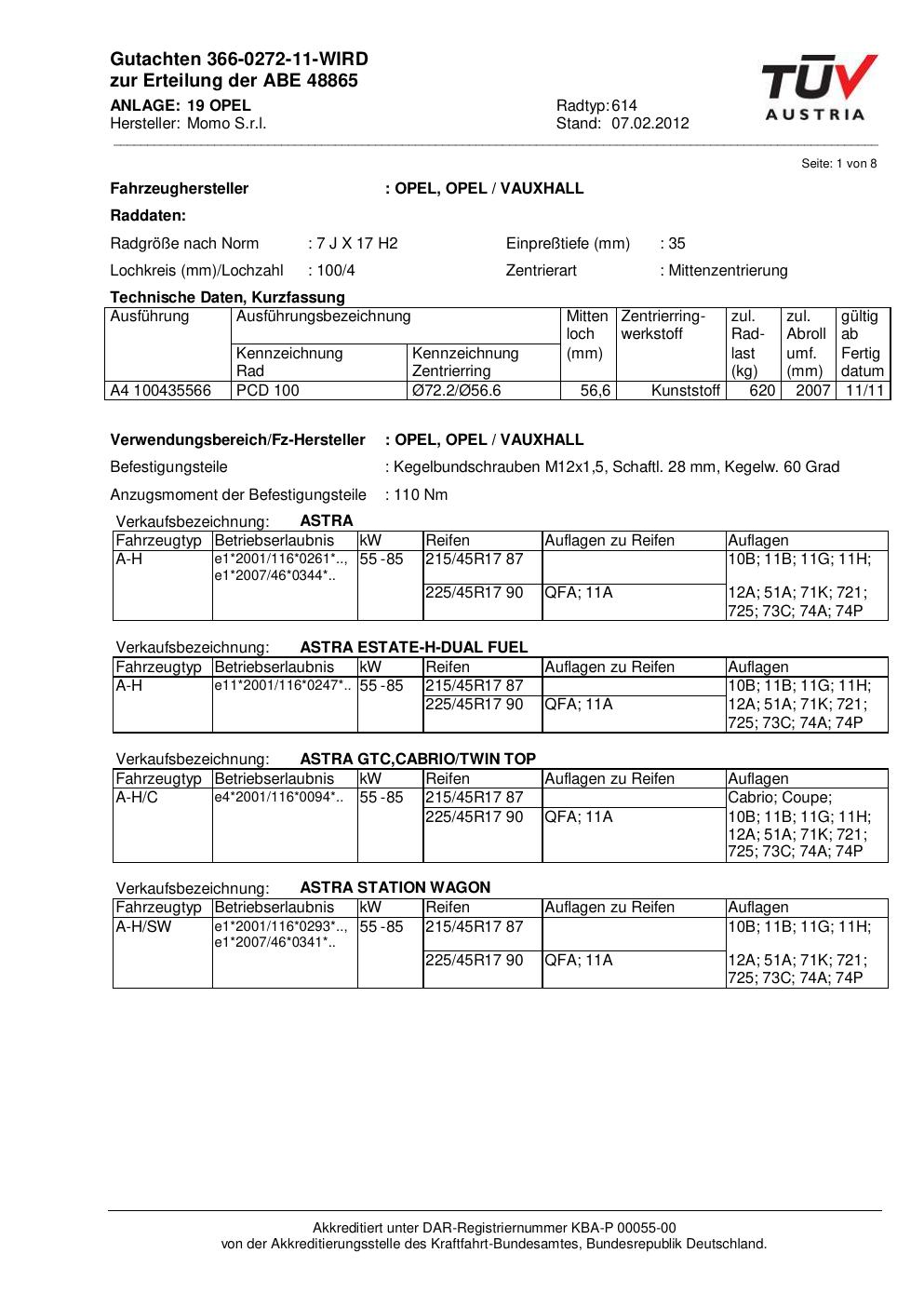 Dieses Gutachten (abe) bezieht sich auf die Alufelge Momo 614 in der Ausführung 7Jx17 ET 0, Mittenloch 0 mm (KBA 48865). Im PDF findest du typischerweise zulässige Reifengrößen, Auflagen/Anbauhinweise und – je nach Dokument – Hinweise zur Eintragung.