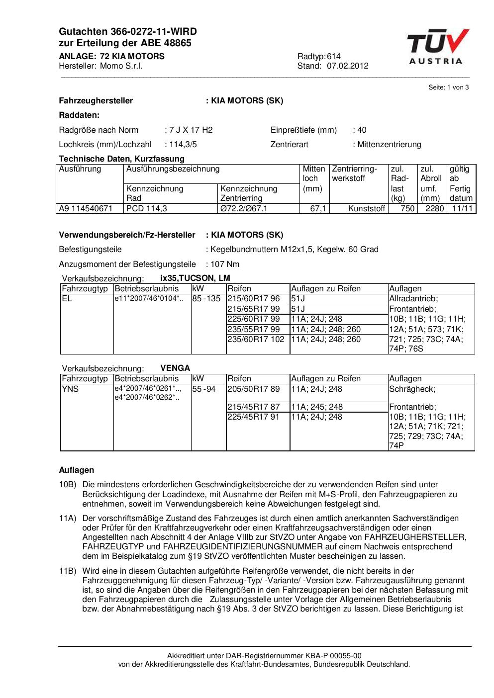 Dieses Gutachten (abe) bezieht sich auf die Alufelge Momo 614 in der Ausführung 7Jx17 ET 0, Mittenloch 0 mm (KBA 48865). Im PDF findest du typischerweise zulässige Reifengrößen, Auflagen/Anbauhinweise und – je nach Dokument – Hinweise zur Eintragung.