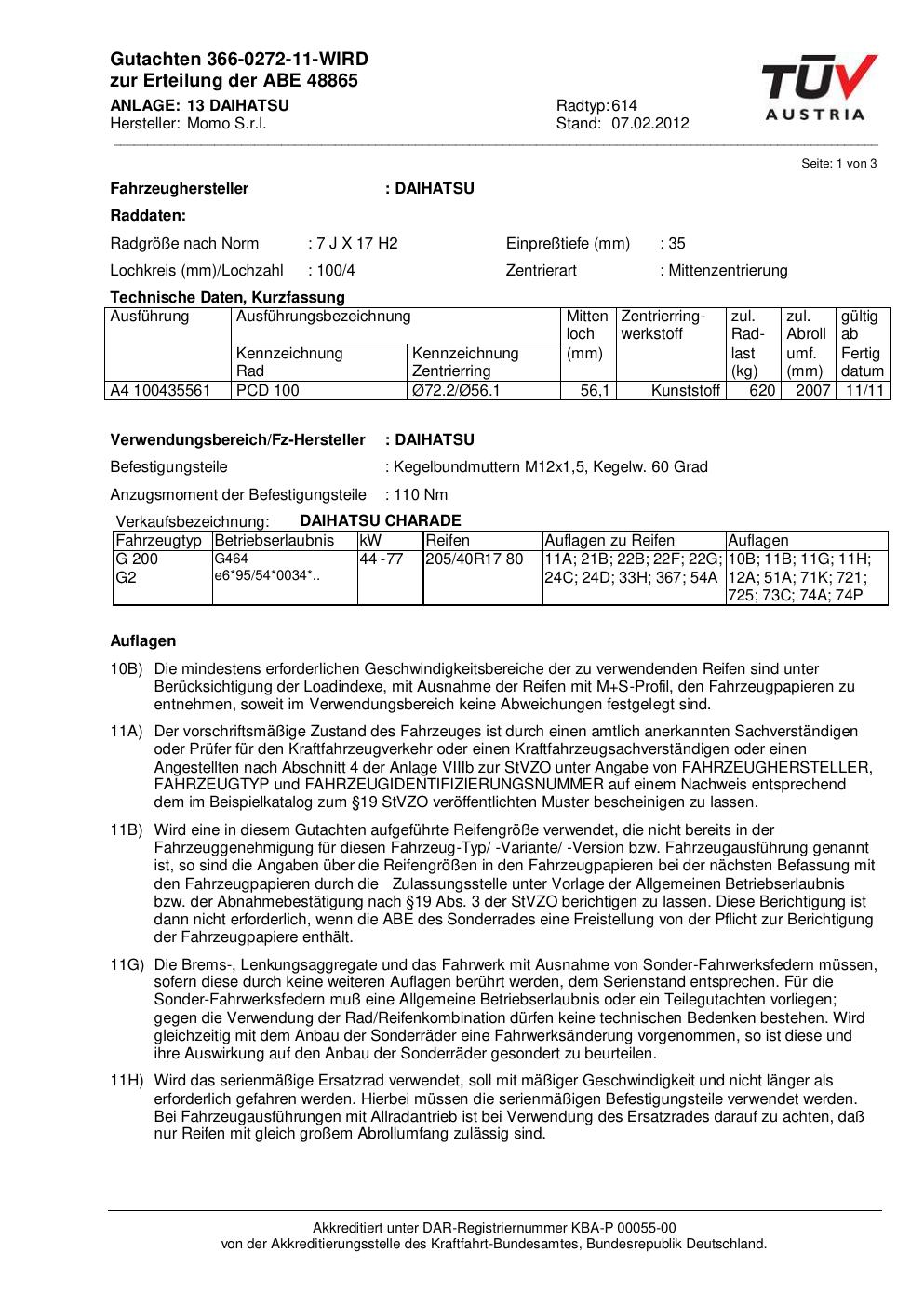 Dieses Gutachten (abe) bezieht sich auf die Alufelge Momo 614 in der Ausführung 7Jx17 ET 0, Mittenloch 0 mm (KBA 48865). Im PDF findest du typischerweise zulässige Reifengrößen, Auflagen/Anbauhinweise und – je nach Dokument – Hinweise zur Eintragung.