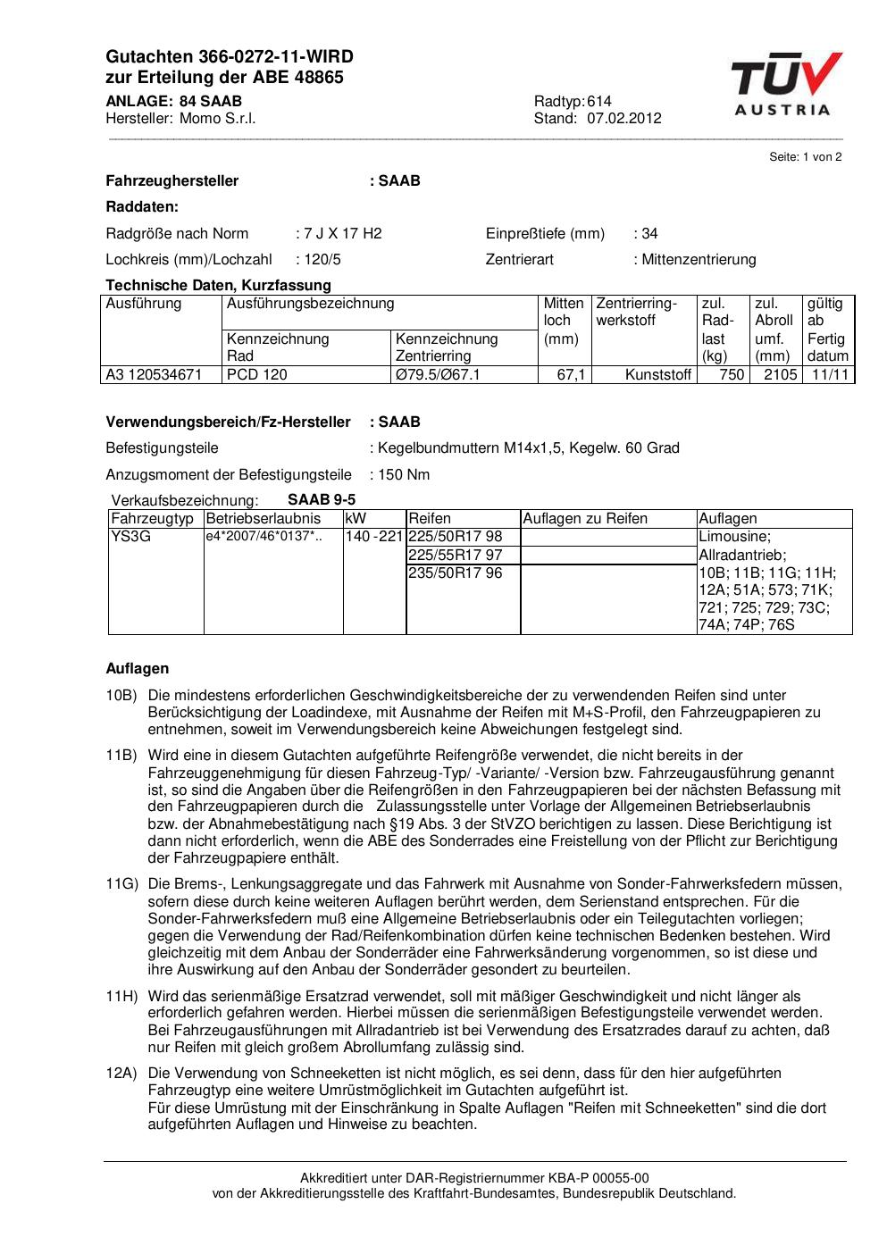 Dieses Gutachten (abe) bezieht sich auf die Alufelge Momo 614 in der Ausführung 7Jx17 ET 0, Mittenloch 0 mm (KBA 48865). Im PDF findest du typischerweise zulässige Reifengrößen, Auflagen/Anbauhinweise und – je nach Dokument – Hinweise zur Eintragung.