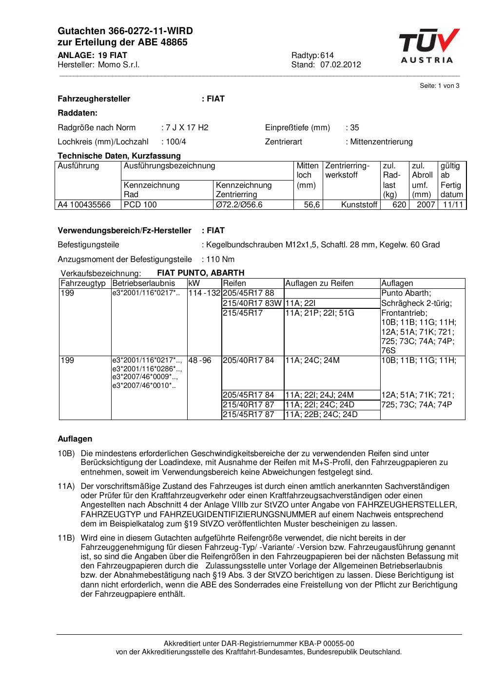 Dieses Gutachten (abe) bezieht sich auf die Alufelge Momo 614 in der Ausführung 7Jx17 ET 0, Mittenloch 0 mm (KBA 48865). Im PDF findest du typischerweise zulässige Reifengrößen, Auflagen/Anbauhinweise und – je nach Dokument – Hinweise zur Eintragung.