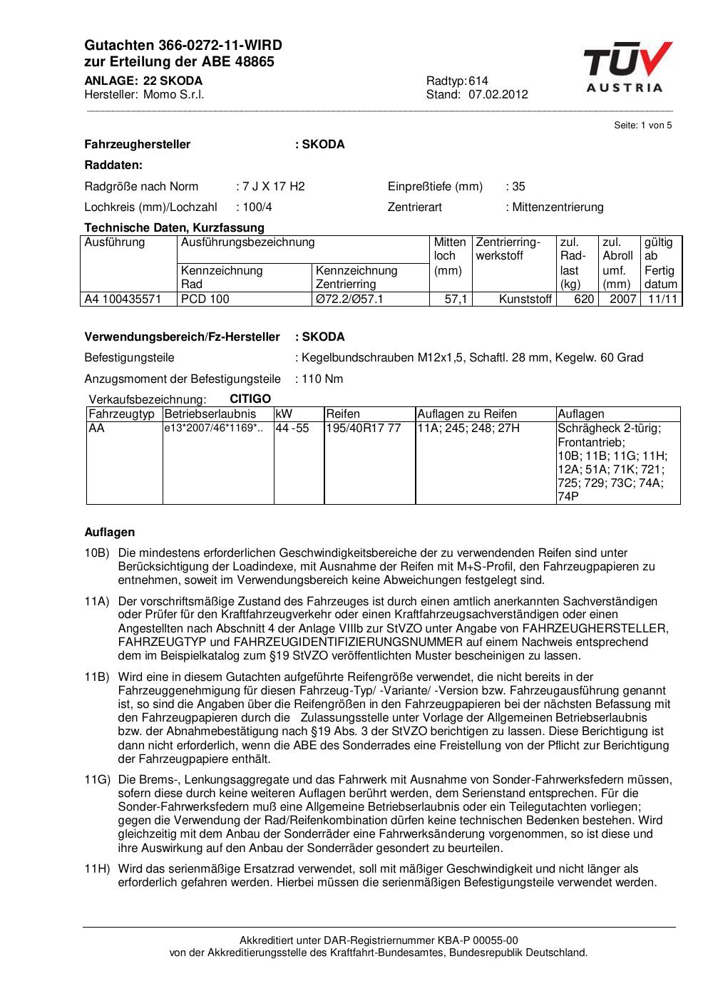 Dieses Gutachten (abe) bezieht sich auf die Alufelge Momo 614 in der Ausführung 7Jx17 ET 0, Mittenloch 0 mm (KBA 48865). Im PDF findest du typischerweise zulässige Reifengrößen, Auflagen/Anbauhinweise und – je nach Dokument – Hinweise zur Eintragung.
