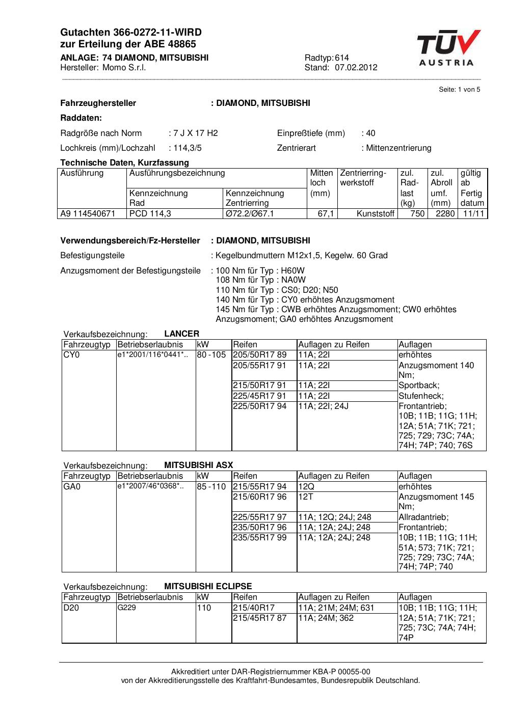 Dieses Gutachten (abe) bezieht sich auf die Alufelge Momo 614 in der Ausführung 7Jx17 ET 0, Mittenloch 0 mm (KBA 48865). Im PDF findest du typischerweise zulässige Reifengrößen, Auflagen/Anbauhinweise und – je nach Dokument – Hinweise zur Eintragung.