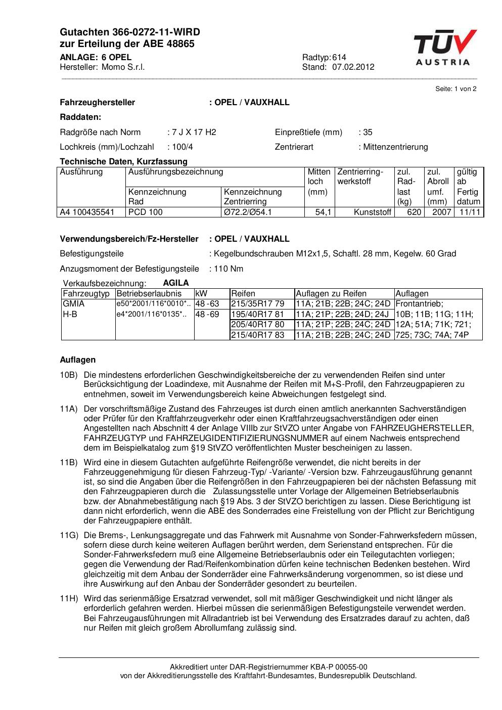 Dieses Gutachten (abe) bezieht sich auf die Alufelge Momo 614 in der Ausführung 7Jx17 ET 0, Mittenloch 0 mm (KBA 48865). Im PDF findest du typischerweise zulässige Reifengrößen, Auflagen/Anbauhinweise und – je nach Dokument – Hinweise zur Eintragung.