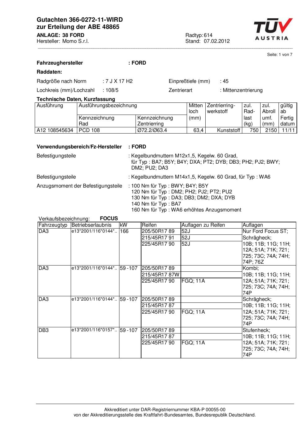 Dieses Gutachten (abe) bezieht sich auf die Alufelge Momo 614 in der Ausführung 7Jx17 ET 0, Mittenloch 0 mm (KBA 48865). Im PDF findest du typischerweise zulässige Reifengrößen, Auflagen/Anbauhinweise und – je nach Dokument – Hinweise zur Eintragung.