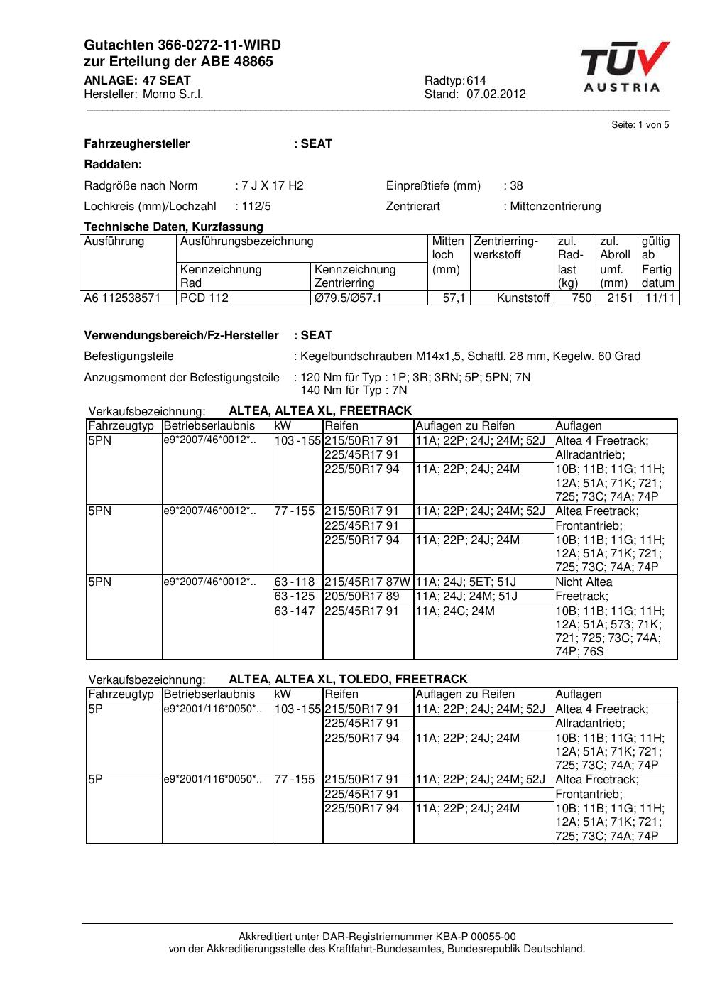 Dieses Gutachten (abe) bezieht sich auf die Alufelge Momo 614 in der Ausführung 7Jx17 ET 0, Mittenloch 0 mm (KBA 48865). Im PDF findest du typischerweise zulässige Reifengrößen, Auflagen/Anbauhinweise und – je nach Dokument – Hinweise zur Eintragung.