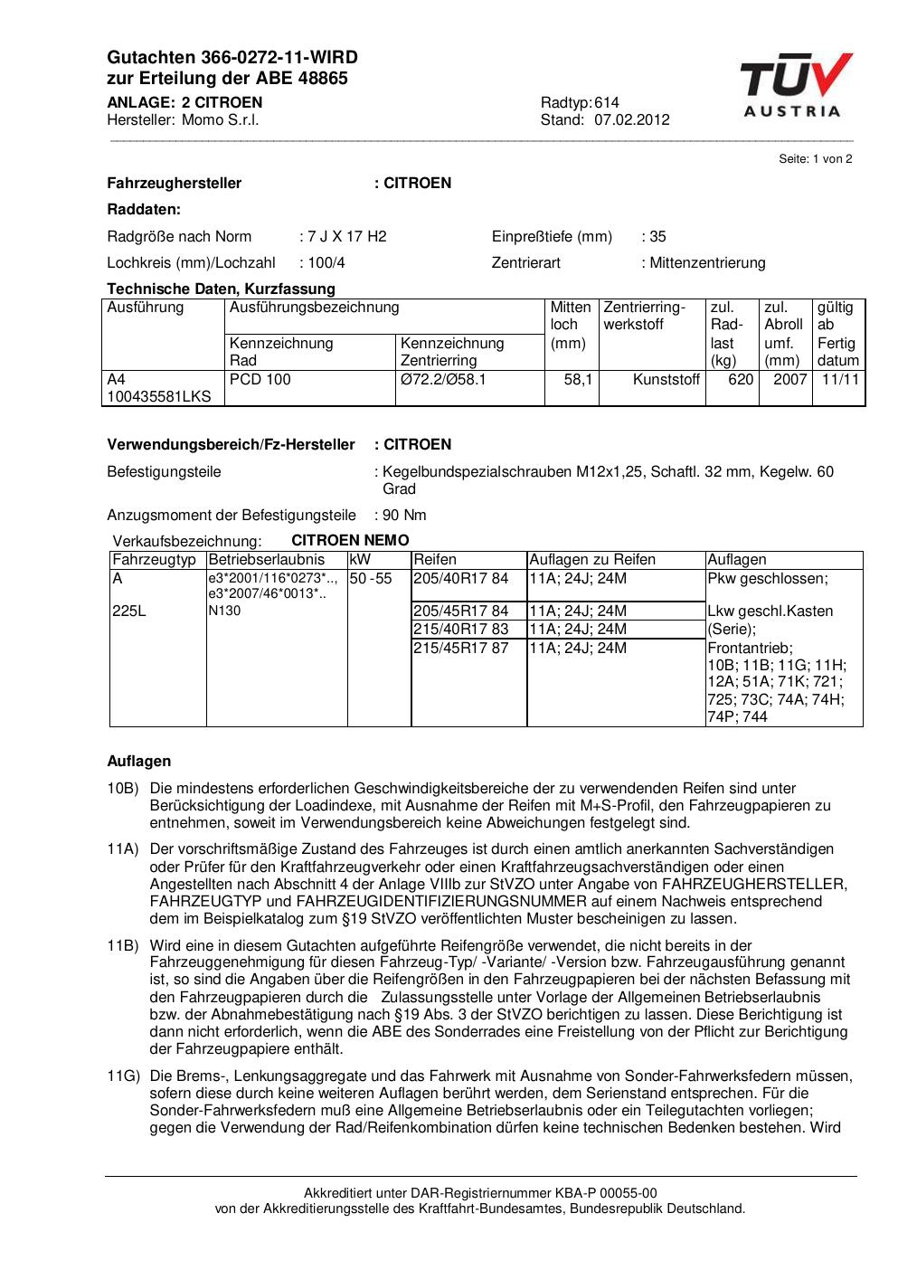 Dieses Gutachten (abe) bezieht sich auf die Alufelge Momo 614 in der Ausführung 7Jx17 ET 0, Mittenloch 0 mm (KBA 48865). Im PDF findest du typischerweise zulässige Reifengrößen, Auflagen/Anbauhinweise und – je nach Dokument – Hinweise zur Eintragung.