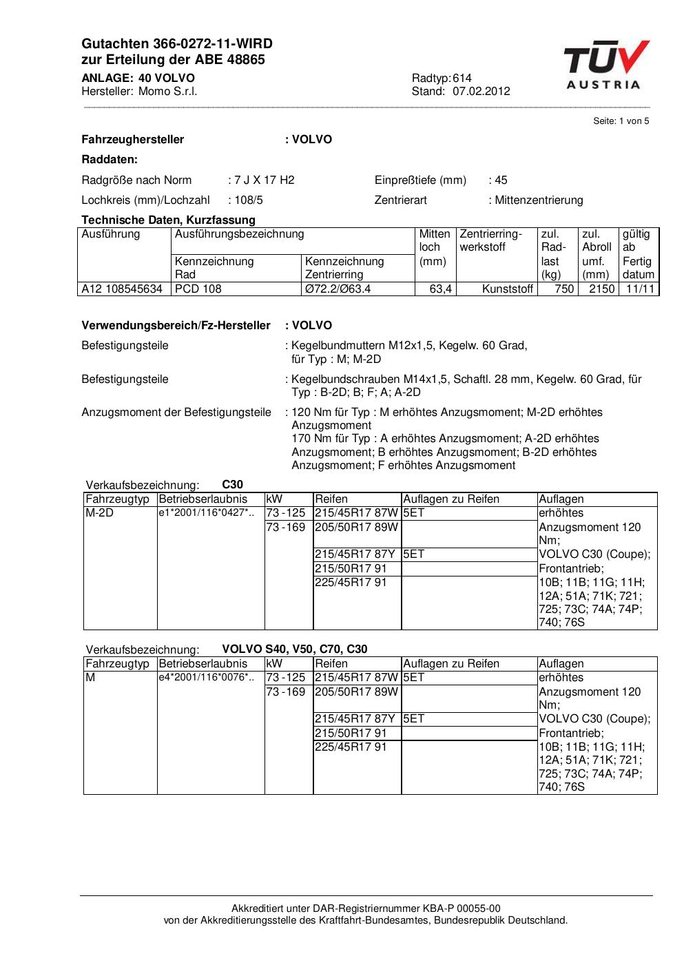Dieses Gutachten (abe) bezieht sich auf die Alufelge Momo 614 in der Ausführung 7Jx17 ET 0, Mittenloch 0 mm (KBA 48865). Im PDF findest du typischerweise zulässige Reifengrößen, Auflagen/Anbauhinweise und – je nach Dokument – Hinweise zur Eintragung.