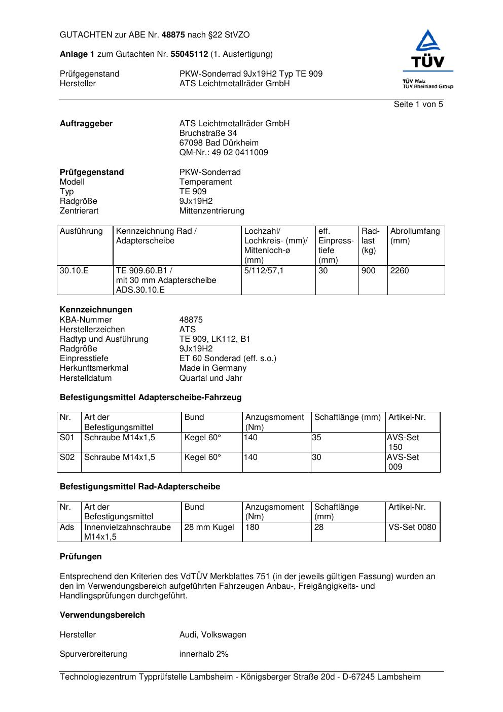 Dieses Gutachten (abe) bezieht sich auf die Alufelge ATS TE 909 in der Ausführung 9Jx19 ET 0, Mittenloch 0 mm (KBA 48875). Im PDF findest du typischerweise zulässige Reifengrößen, Auflagen/Anbauhinweise und – je nach Dokument – Hinweise zur Eintragung.
