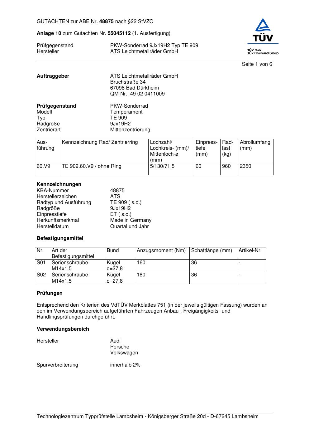 Dieses Gutachten (abe) bezieht sich auf die Alufelge ATS TE 909 in der Ausführung 9Jx19 ET 0, Mittenloch 0 mm (KBA 48875). Im PDF findest du typischerweise zulässige Reifengrößen, Auflagen/Anbauhinweise und – je nach Dokument – Hinweise zur Eintragung.